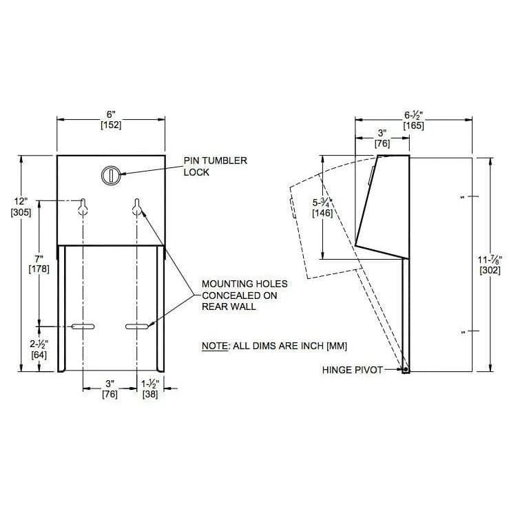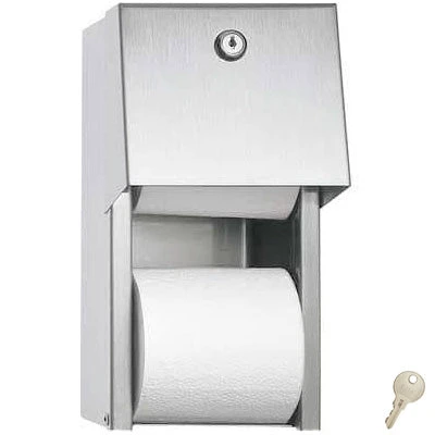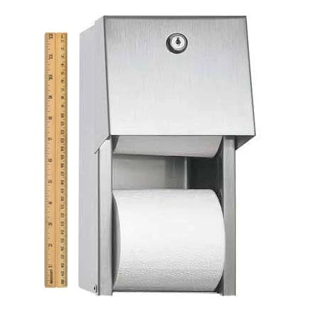The ASI 0030 Surface Mounted Dual Roll Toilet Tissue Dispenser allows you to keep two rolls of toilet tissue in each of the compartments or stalls in your commercial washroom. The design of the unit keeps one roll exposed for dispensing and the other roll hidden behind a type-304, 18-gauge stainless steel door. To protect the roll that is not in use, the door is equipped with a pin tumbler lock. This lock also prevents the chrome-plated ABS plastic rollers from being removed. Once the bottom roll becomes entirely depleted, the top roll automatically drops into place. The holder accepts toilet tissue rolls with standard rolls that are up to 5-1/4 inches in diameter. All of the exposed surfaces on the unit feature a number 4 satin finish, which resists fingerprinting, but still has an attractive sheen. The unit mounts securely to any hard surface and measures 6 inches in width by 12 inches in height by 6-1/2 inches in depth.