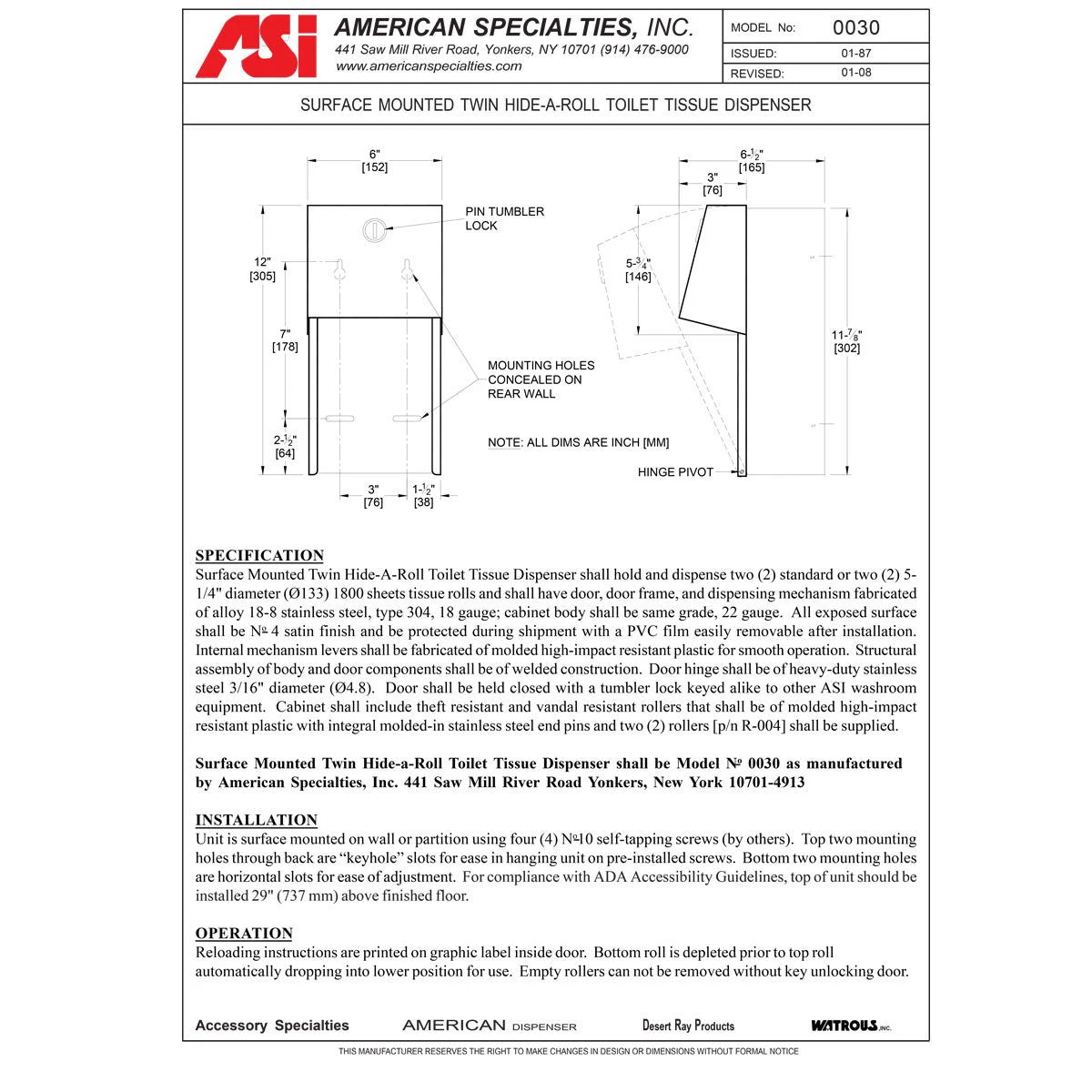 SPECIFICATION Surface Mounted Twin Hide-A-Roll Toilet Tissue Dispenser shall hold and dispense two (2) standard or two (2) 5- 1/4″ diameter (Ø133) 1800 sheets tissue rolls and shall have door, door frame, and dispensing mechanism fabricated of alloy 18-8 stainless steel, type 304, 18 gauge; cabinet body shall be same grade, 22 gauge. All exposed surface shall be No 4 satin finish and be protected during shipment with a PVC film easily removable after installation. Internal mechanism levers shall be fabricated of molded high-impact resistant plastic for smooth operation. Structural assembly of body and door components shall be of welded construction. Door hinge shall be of heavy-duty stainless steel 3/16″ diameter (Ø4.8). Door shall be held closed with a tumbler lock keyed alike to other ASI washroom equipment. Cabinet shall include theft resistant and vandal resistant rollers that shall be of molded high-impact resistant plastic with integral molded-in stainless steel end pins and two (2) rollers [p/n R-004] shall be supplied.