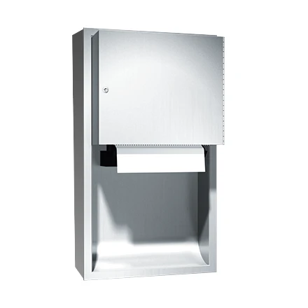 Dispenses one 8″ diameter (Ø203) x 8″ (203) wide standard towel roll up to 800 ft. (244m) long and one 8″ wide (203) stub roll up to 4″ diameter (Ø102).