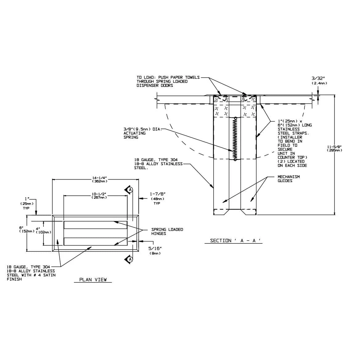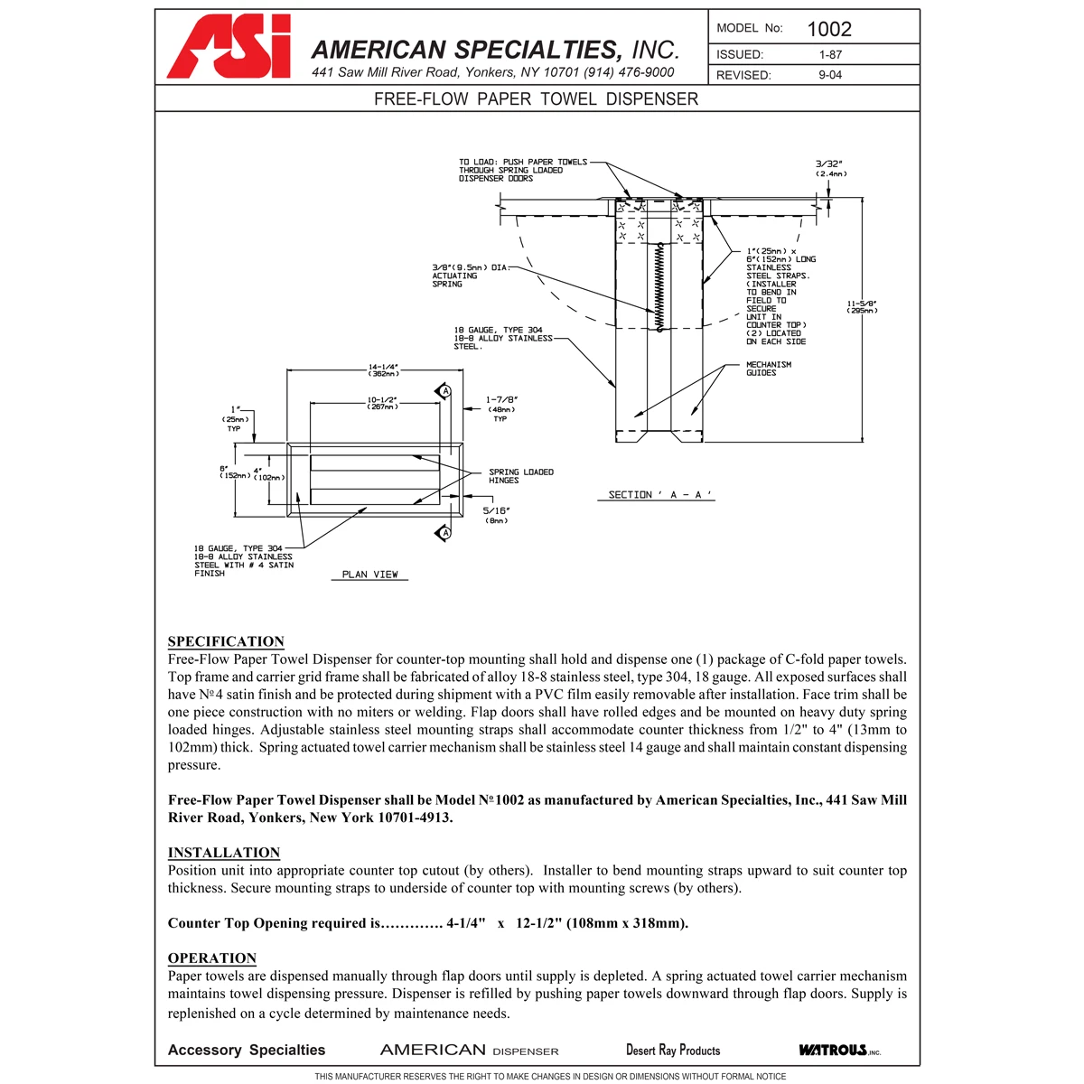 The ASI 1002 Counter Top Paper Towel Dispenser installs right into the counter top surface of your sink area, making it an excellent solution for providing paper towels in restrooms where the design makes it difficult to add a wall-mounted unit. The dispenser is crafted from type-304, 18-gauge stainless steel and requires a rough opening that measures 4-1/2 inches in height by 12-1/2 inches in length. To properly install the unit, the counter top must be 1/2 of an inch to 4 inches in thickness. The unit features flap doors mounted on heavy-duty stainless steel springs and can hold one package of C fold or multifold paper towels. The towel dispensing mechanism located inside of the dispenser is manufactured from heavy-duty, 14-gauge stainless steel. The mechanism is spring actuated to keep constant tension inside of the unit and continuously push the unused towels forward in the dispenser, so that they can be retrieved by users.