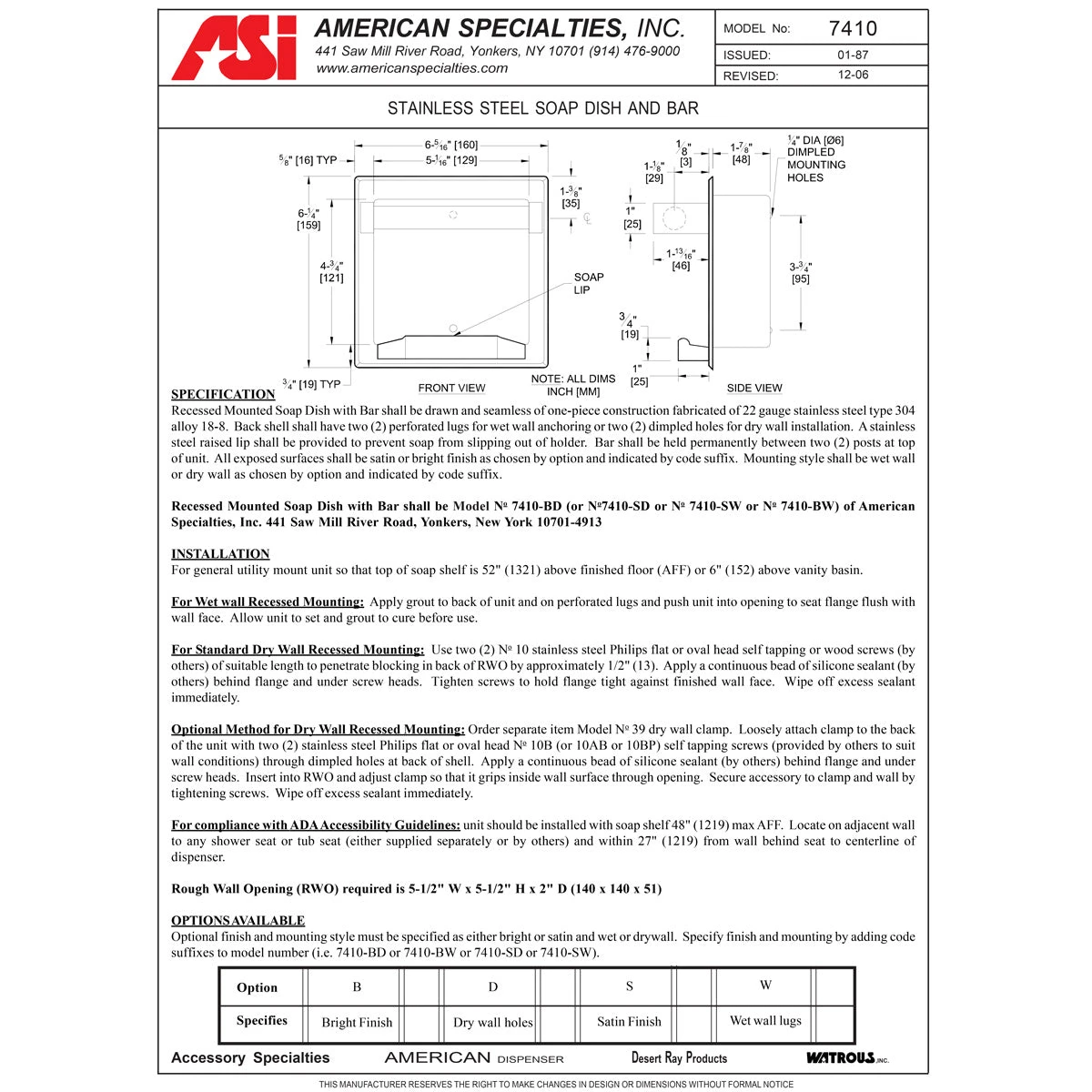 The ASI 7410-S Soap Dish is a recessed model soap tray that is perfect for use in sink, tub and shower areas, where there is a rough wall opening that measures 5-1/2 inches in width by 5-1/2 inches in height by 2 inches in depth. Once installed, the soap dish extends from the wall by only 1 inch. The unit is made of one piece of 22-gauge, type-304 stainless steel and features an attractive satin finish. Along the front of the soap dispenser, a raised lip is positioned to prevent the likelihood of the soap slipping out of the dispenser and onto the floor. A 3/4-inch stainless steel bar is also included in the design. The unit measures 6-1/4 inches in height by 6-5/16 inches in width overall. To ensure compliance with ADA and other barrier-free accessibility guidelines, mount the soap dish 48 inches above the floor positioned so that it is 27 inches from the wall behind a shower or tub seat, where applicable.