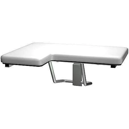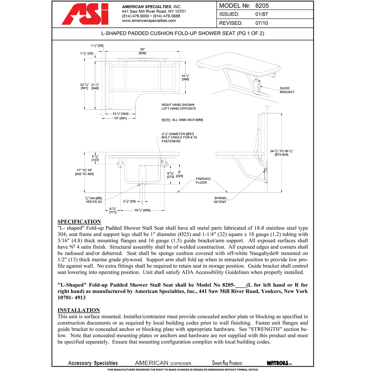 The ASI 8205-R Compact Folding Seat is ideal for offering a safety seat in shower stalls and tubs where you wish to orient the seat for right-hand use. The shower seat is made of marine grade plywood that measures 1/2 of an inch in thickness. For added comfort, the seat is covered with sponge padding and off-white naugahyde. The seat’s surface measures 33 inches at its widest point by 22-7/8 inches at its deepest point. All of the metal parts that are attached to the seat are made of type-304, 18-8 alloy stainless steel tubing with an attractive No. 4 satin finish on all of the exposed surfaces. The frame and support legs are fabricated out of sturdy 18-gauge stainless steel. When the folding seat is not in use, its support arm can be retracted to create extra space in the tub or shower. A guide bracket is included in the design of the seat to prevent it from falling out of its folded position. The seat complies fully with ADA.