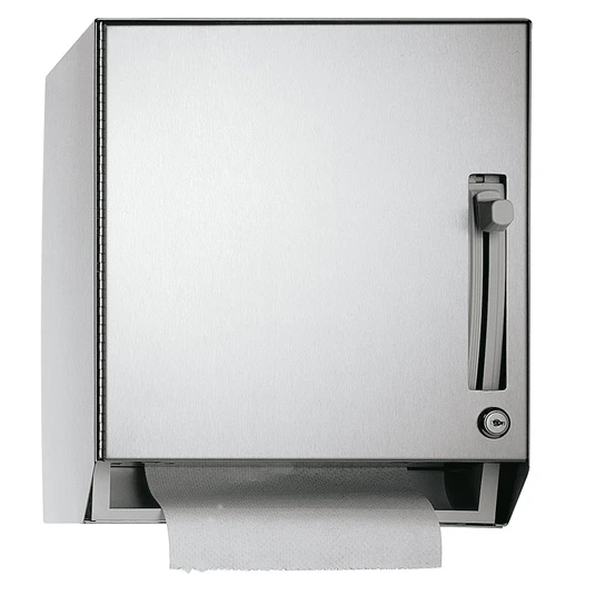The ASI 8522 Roll Paper Towel Dispenser features a unique design to help prevent the unit from running out of paper towels between replenishments. In addition to holding one standard paper towel roll that measures 8 or 9 inches in diameter, the unit also holds a stub roll that is 4 inches in diameter. When users dispense towels, the main roll is used, but if that roll becomes completely depleted, the unit will begin to draw towels from the stub roll automatically. To dispense towels, users pull down a lever. The paper towel dispenser can dispense towels in lengths of 2-1/2 inches, 4 inches or 5 inches. Designed for mounting on hard surfaces, the dispenser is crafted from type-304 stainless steel and consists of a cabinet and a door joined with a continuous stainless steel piano hinge. The unit measures 12-1/4 inches in width by 15 inches in height by 9-1/2 inches in depth.