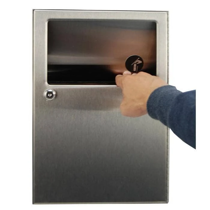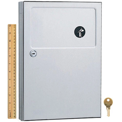 Satin-finish stainless steel. Door has tumbler lock. Self-closing panel covers disposal opening. Removable, leak-proof, 1.2-gal. (4.6-L) plastic receptacle. Unit 10 11/16″ W, 15 1/8″ H, 4 1/16″ D (270 x 385 x 105mm).