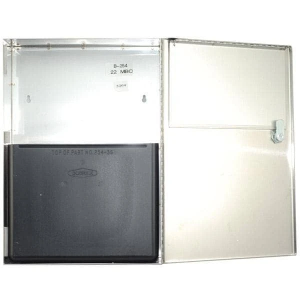 Door — 18-8, type-304, 22-gauge (0.8mm) stainless steel with satin finish. Secured to cabinet with a full-length stainless steel piano-hinge. Equipped with a tumbler lock keyed like other Bobrick washroom accessories.