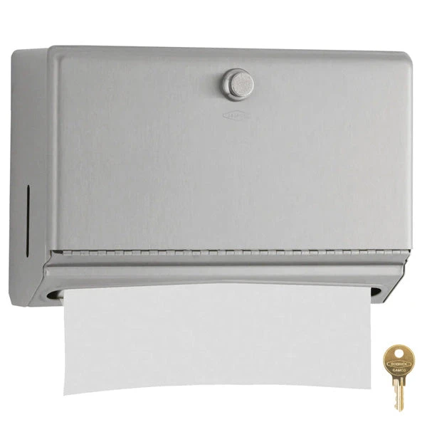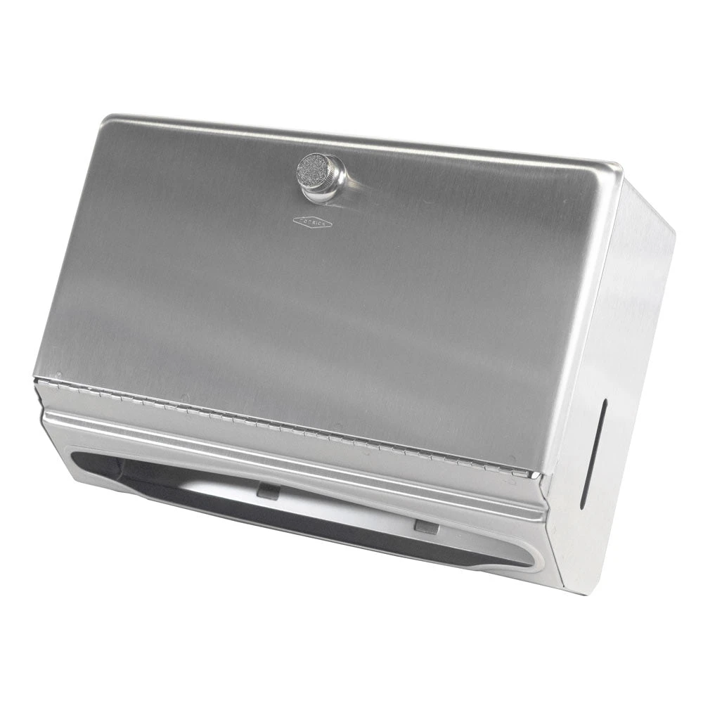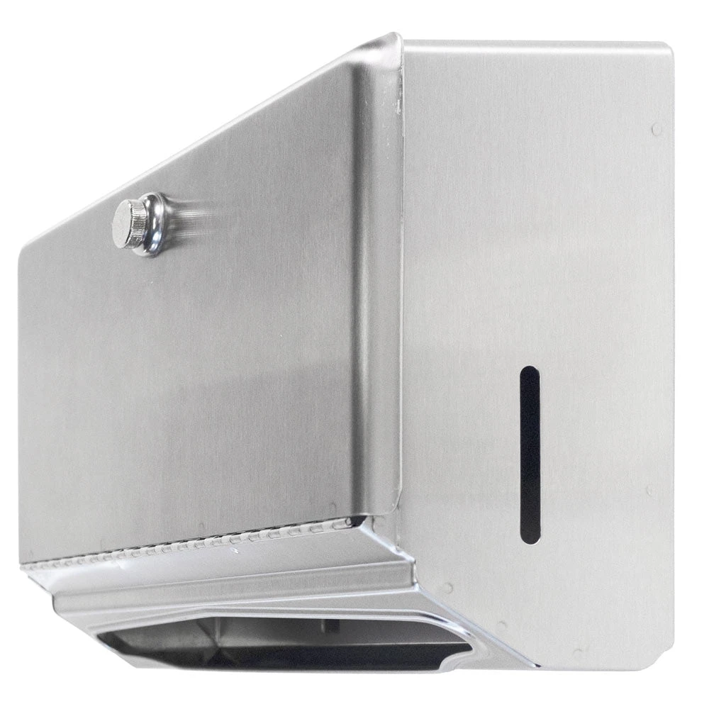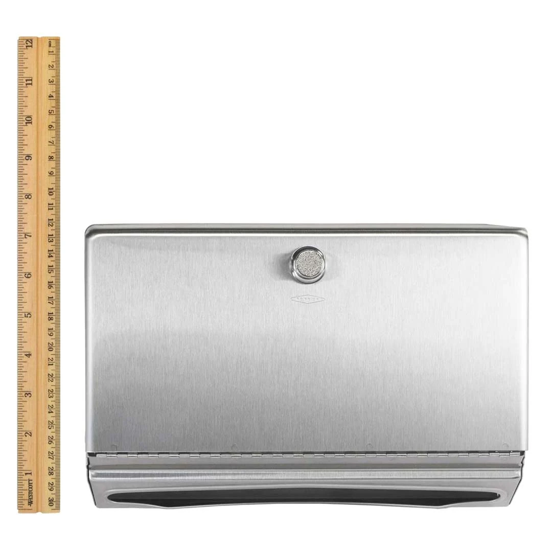Satin-finish stainless steel. Dispenses 200 C-fold or 275 multifold towels. Door has knob-latch. Hemmed towel tray opening. Unit 10 3/4″ W, 7 1/8″ H, 4″ D (275 x 180 x 100mm).