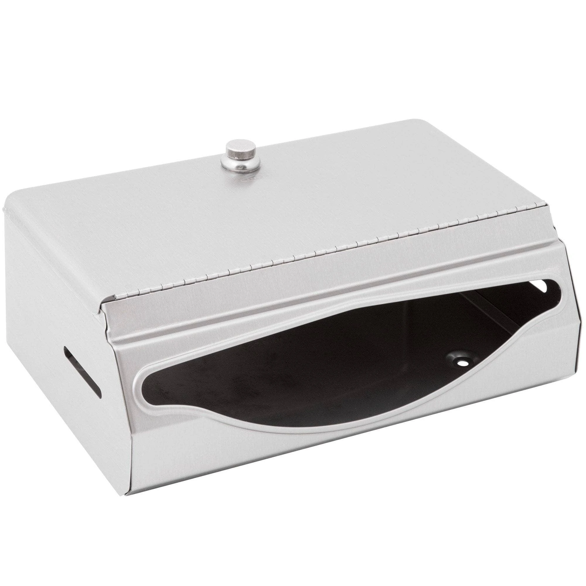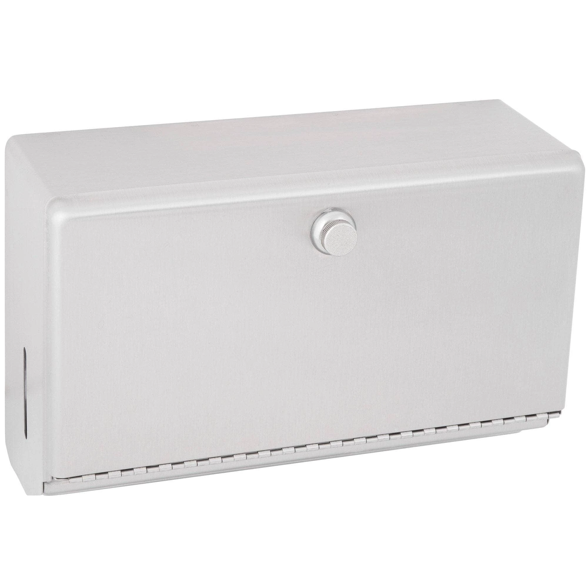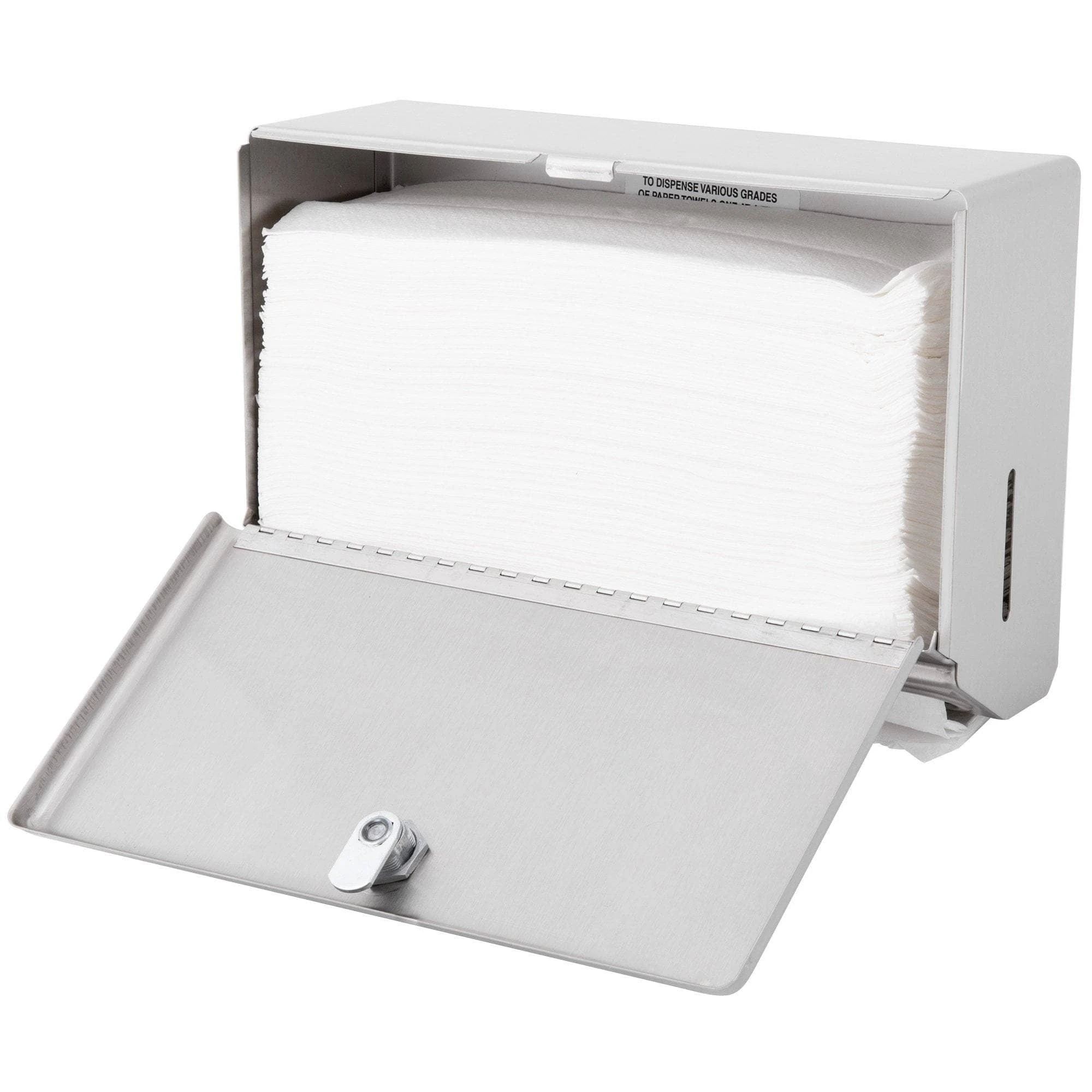 Satin-finish stainless steel. Dispenses 200 C-fold or 275 multifold towels. Door has knob-latch. Hemmed towel tray opening. Unit 10 3/4″ W, 7 1/8″ H, 4″ D (275 x 180 x 100mm).