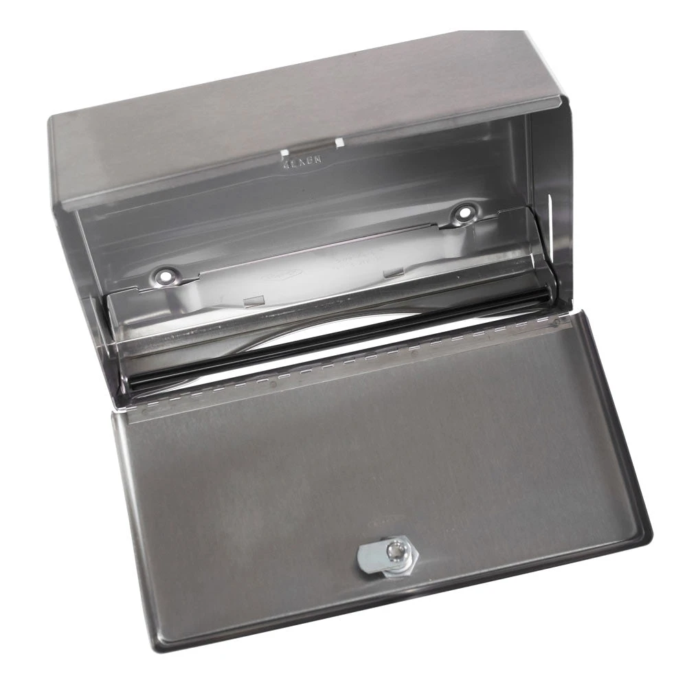 Surface-mounted paper towel dispenser shall be type-304 stainless steel with all-welded construction; exposed surfaces shall have satin finish. Door shall be secured to cabinet with a full-length stainless steel piano-hinge and equipped with a knob latch. Paper towel tray shall have hemmed opening to dispense paper towels without tearing. Unit shall be capable of dispensing 200 C-fold or 275 multifold paper towel measuring 3-1/8″ to 3-13/16″ (79 to 97mm) deep. Narrower paper towels 2-1/2″ to 3-1/8″ (65 to 79mm) deep may be efficiently dispensed with the use of an optional TowelMate accessory, Bobrick Part No. 262-130. TowelMate accessory allows for paper towels to dispense one at a time without bulging, sagging or falling through the towel tray opening.
