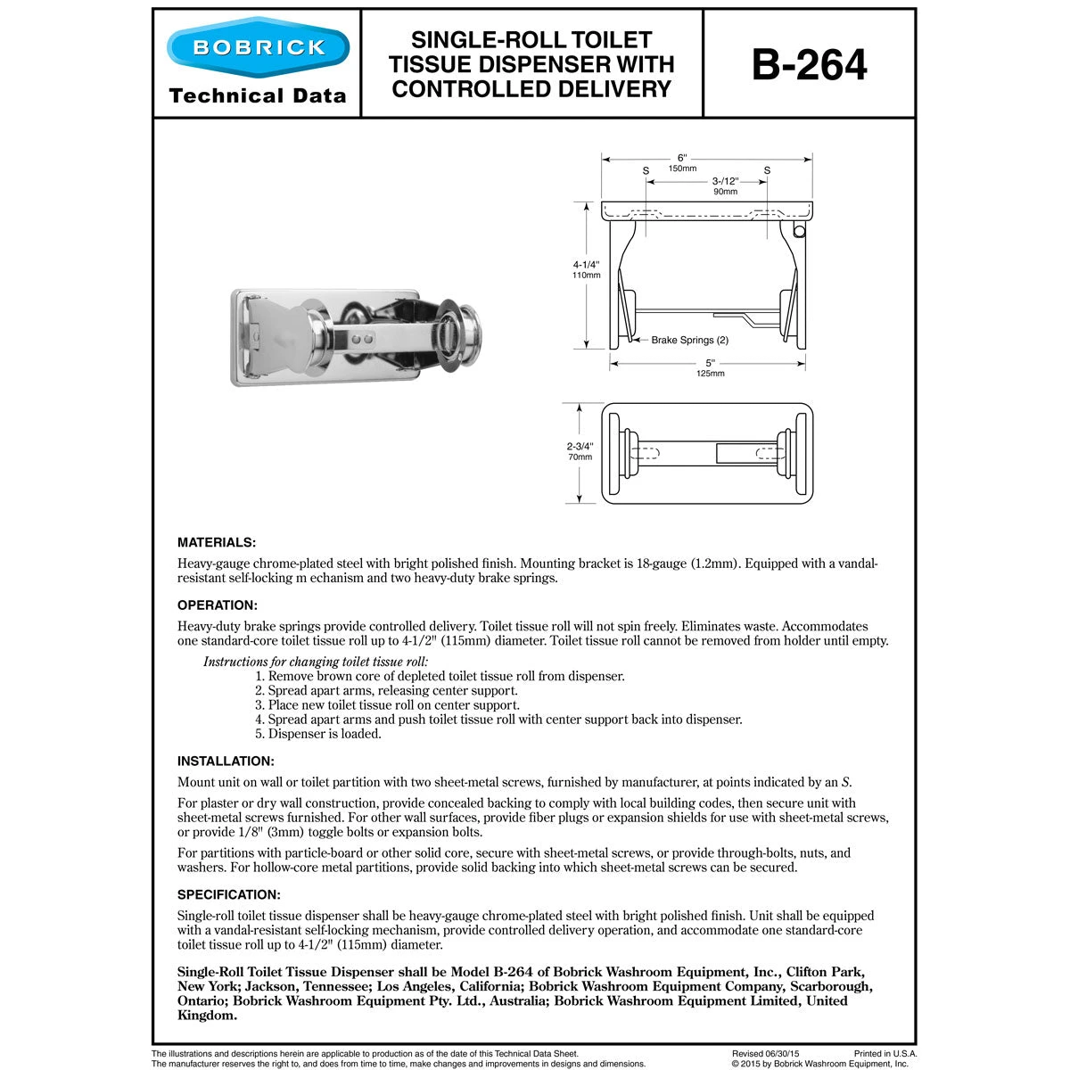 Bright-polished chrome-plated steel. Self-locking mechanism. Controlled delivery. Accommodates one standard-core toilet tissue roll up to 4 1/2″ (115mm) diameter. Roll cannot be removed from dispenser until empty. Unit 6″ W, 2 3/4″ H (150 x 70mm); projects 4 1/4″ (110mm) from wall.