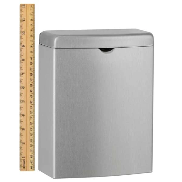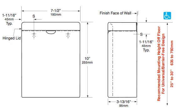 Container — 18-8, type-304, 22-gauge (0.8mm) stainless steel. All-welded construction. Exposed surfaces have satin finish. Integral finger depression for opening cover. Front of container has same degree of arc as front of cover and other Bobrick ConturaSeries washroom accessories. Radius on side edges of container match corners and edges of cover and other ConturaSeries accessories.