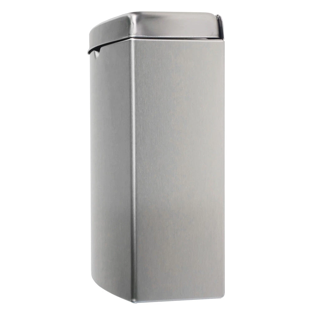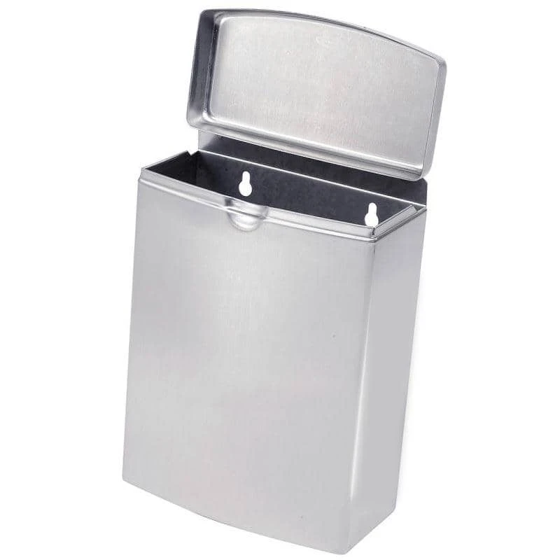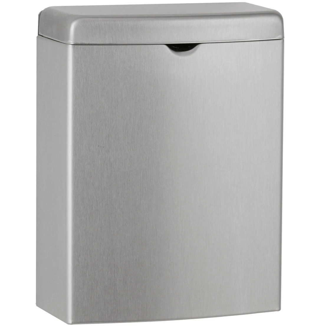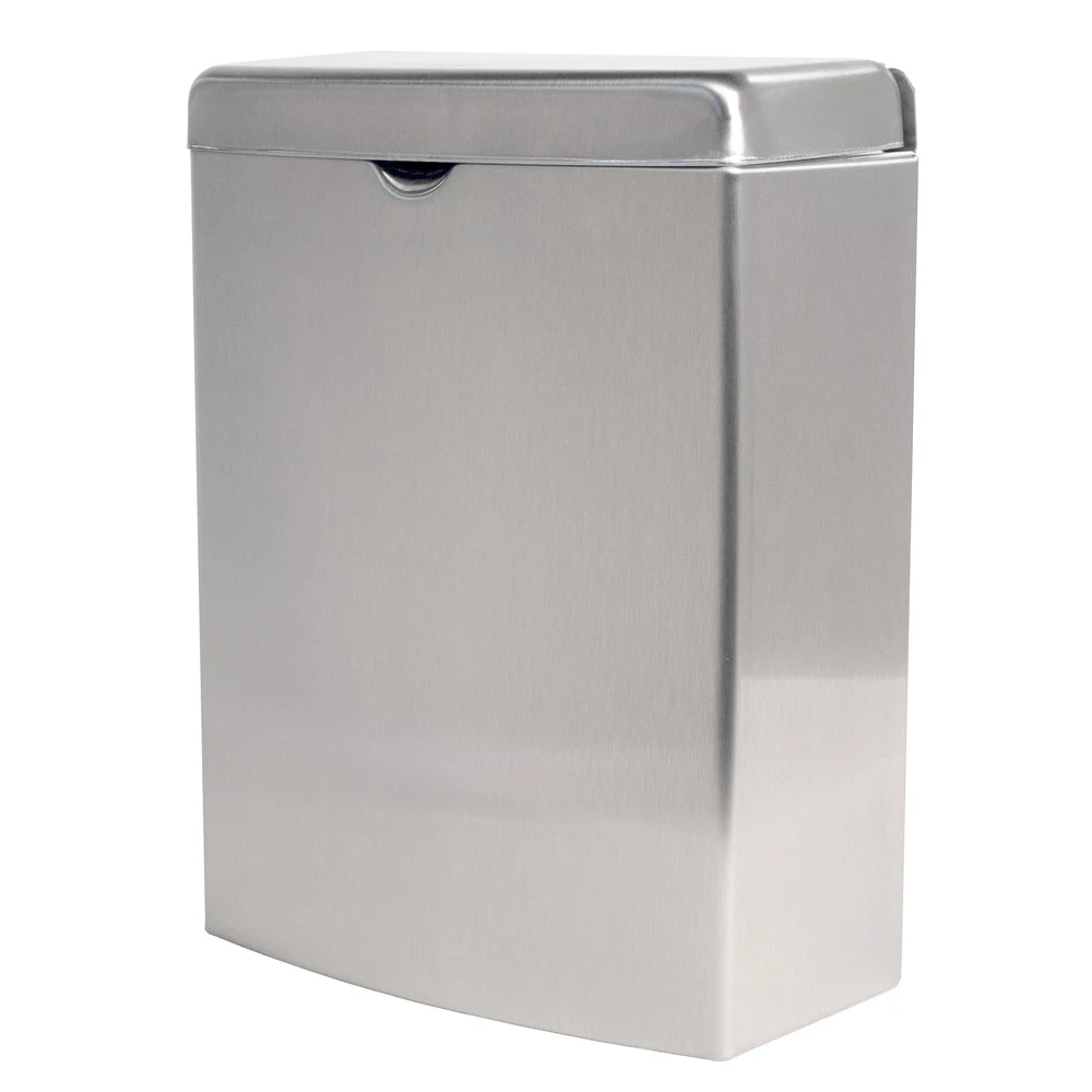 Surface-mounted sanitary napkin disposal shall be type-304 stainless steel with all-welded construction; exposed surfaces shall have satin finish. Front of sanitary napkin disposal shall have same degree of arc and match other Bobrick ConturaSeries accessories in the washroom. Radius on corners and edges of sanitary napkin disposal shall complement other Bobrick ConturaSeries washroom accessories. Cover shall be drawn, one-piece, seamless construction and secured to container with a full-length stainless steel piano-hinge. Container shall have integral finger depression for opening cover.