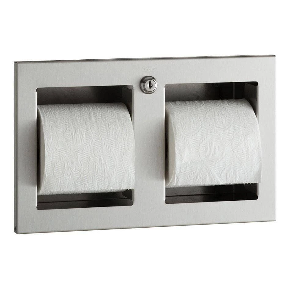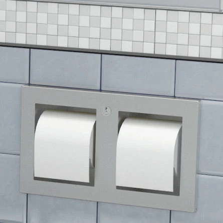 Satin-finish stainless steel unit with all-welded construction. Unit is theft resistant and equipped with a tumbler lock keyed like other Bobrick washroom accessories. Dispenser holds two standard-core toilet tissue rolls up to 5 1/8″ (130mm) diameter (1500 sheets). Rough Wall Opening: 12 1/2″ W x 7 3/8″ H x 4″ min. depth (318 x 187 x 102mm).