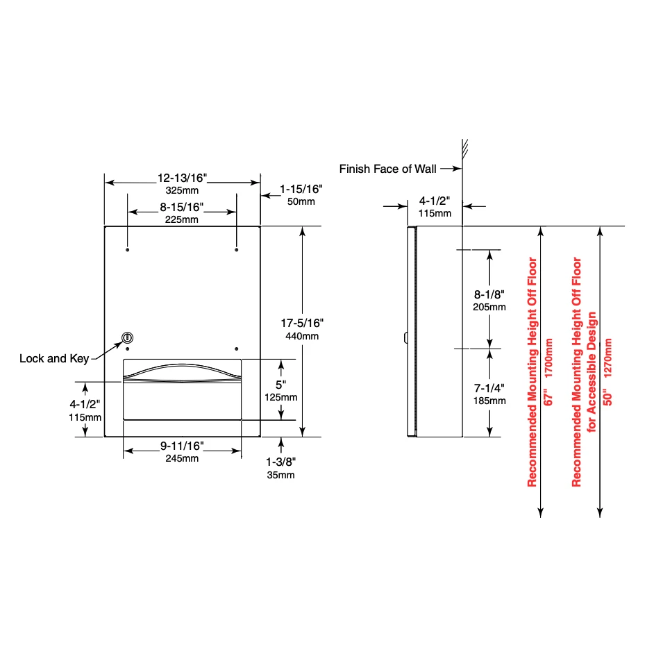 Satin-finish stainless steel. Unit equipped with one tumbler lock keyed like other Bobrick washroom accessories. Dispenses 300 C-fold or 400 multifold towels. Skirt is removable in the field for optional recessed mounting. Unit Size: 12 13/16″ W x 17 15/16″ H x 4 1/2″ D (325 x 440 x 115mm).