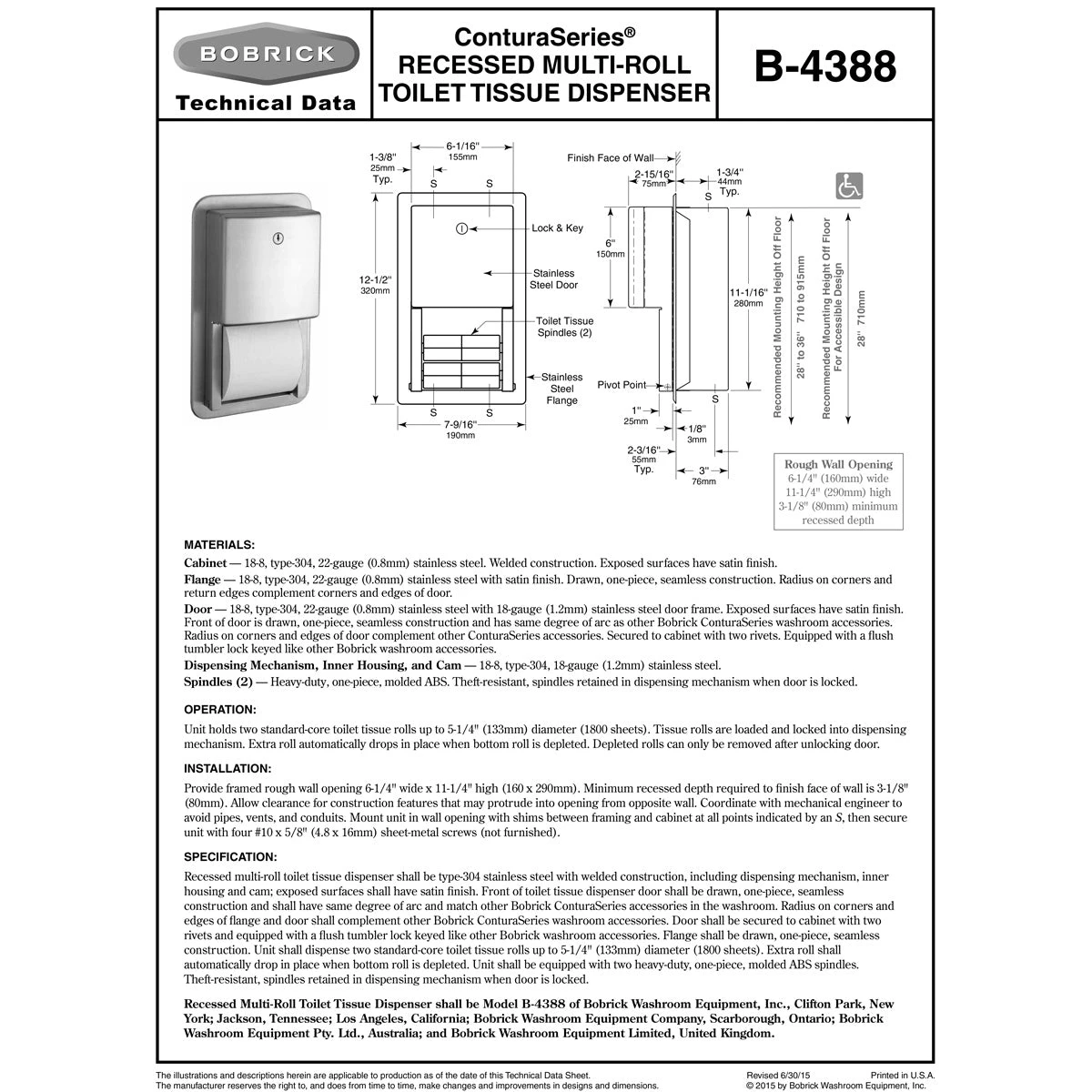 Satin-finish stainless steel unit and dispensing mechanism. Flush tumbler lock. Holds two rolls up to 5 1/4″ (133mm) diameter (1800 sheets). Extra roll drops in place when bottom roll is depleted. Theft-resistant, heavy-duty spindles. Extends 2 3/4″ (70mm) from wall. Rough Wall Opening: 6 1/4″ W, 11 1/4″ H, 3 1/4″ min. depth (160 x 285 x 85mm).