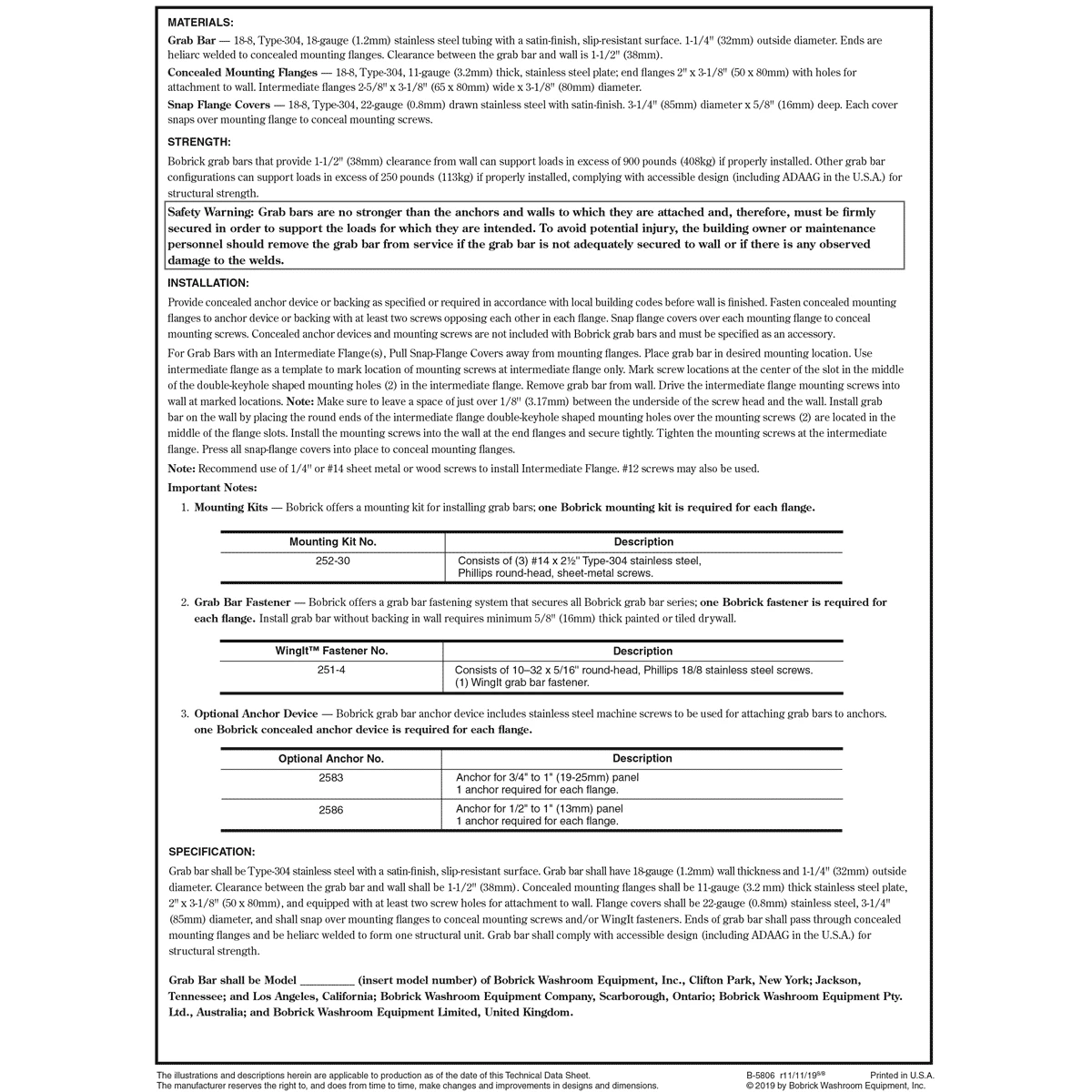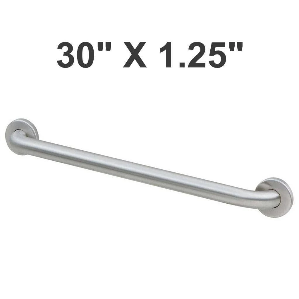 30″ (760mm) long, 1 1/4″ (32mm) diameter tubing. Constructed of 18-gauge (1.2mm), type 304 satin-finish stainless steel tubing. Concealed mounting flange 1/8″ (3mm) thick, type 304 stainless steel plate, 2″ W x 3 1/8″ H (50 x 80mm), with screw holes for concealed anchors. Cover is 22-gauge (0.8mm), type 304 stainless steel with satin finish, 3 1/4″ (85mm) diameter. Cover snaps over mounting flange to conceal screws.