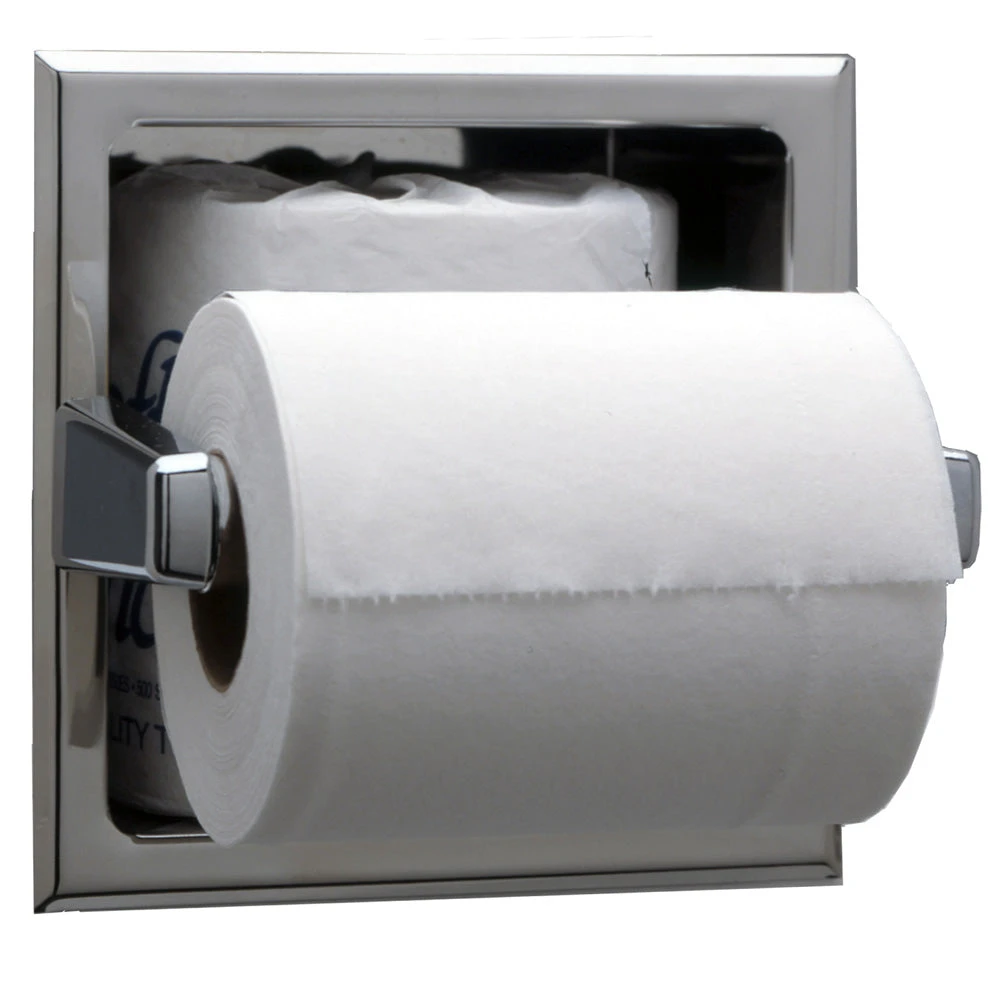 Satin stainless steel. Chrome-plated plastic spindle holds rolls up to 5 1/8″ (130mm) diameter (1500 sheets). Recessed cabinet 3 15/16″ (100mm) deep holds spare roll. Unit 6 1/4″ W, 6 1/4″ H (160 x 160mm). Rough Wall Opening: 5 1/2″ W, 5 1/2″ H, 4″ min. depth (140 x 140 x 100mm).