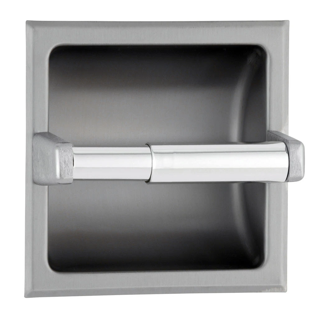 Type 304 stainless steel with one-piece seamless construction. Satin finish. Chrome-plated plastic spindles hold rolls up to 5 1/8″ (130mm) diameter (1500 sheets). Single-roll model measure 6 1/8″ W x 6 1/8″ H (155 x 155mm). Mounting: clamps for securing to stud walls or countertop aprons.Rough Wall Opening: 5 1/2″ W x 5 1/4″ H x 3 3/8″ min.depth (140 x 135 x 85mm).