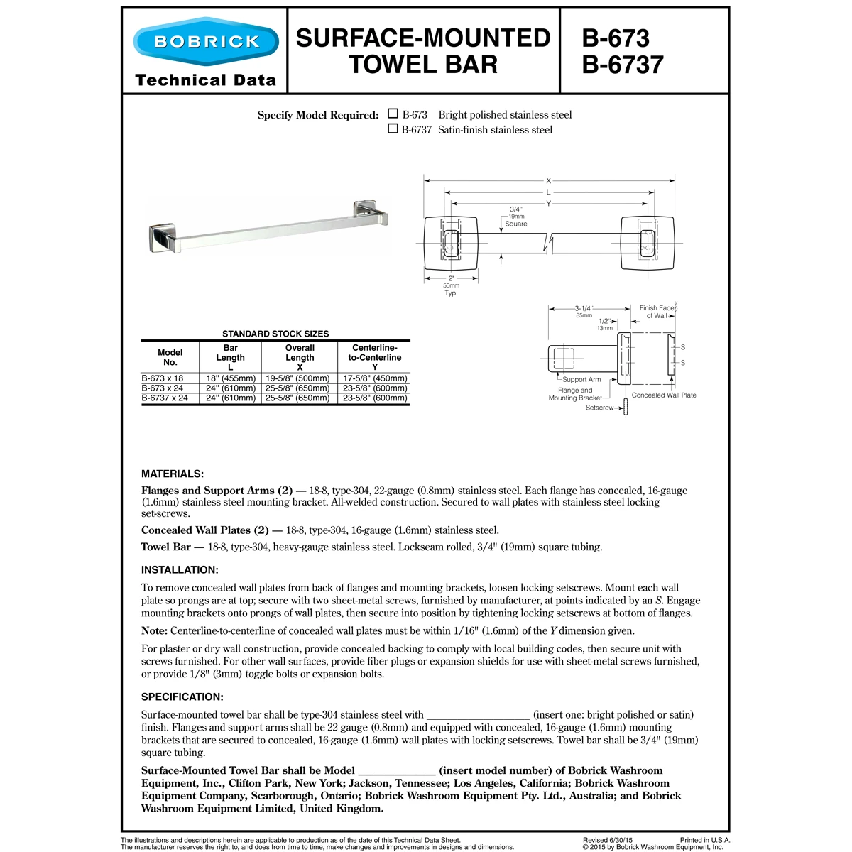 For use in hospital and hotel bathrooms. Stainless steel. 3/4″ (19mm) square towel bar. Projects 3 1/4″ (85mm) from wall. Available Towel Bar Lengths and Finishes: B-673 x 18-18″ (455mm), Bright-polished. B-673 x 24-24″ (610mm), Bright-polished. B-6737 x 24-24″ (610mm), Satin-finish.