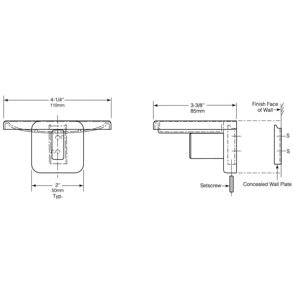 - Unit 4 1/4″ W, 2″ H (110 x 50mm); projects 3 3/8″ (85mm) from wall