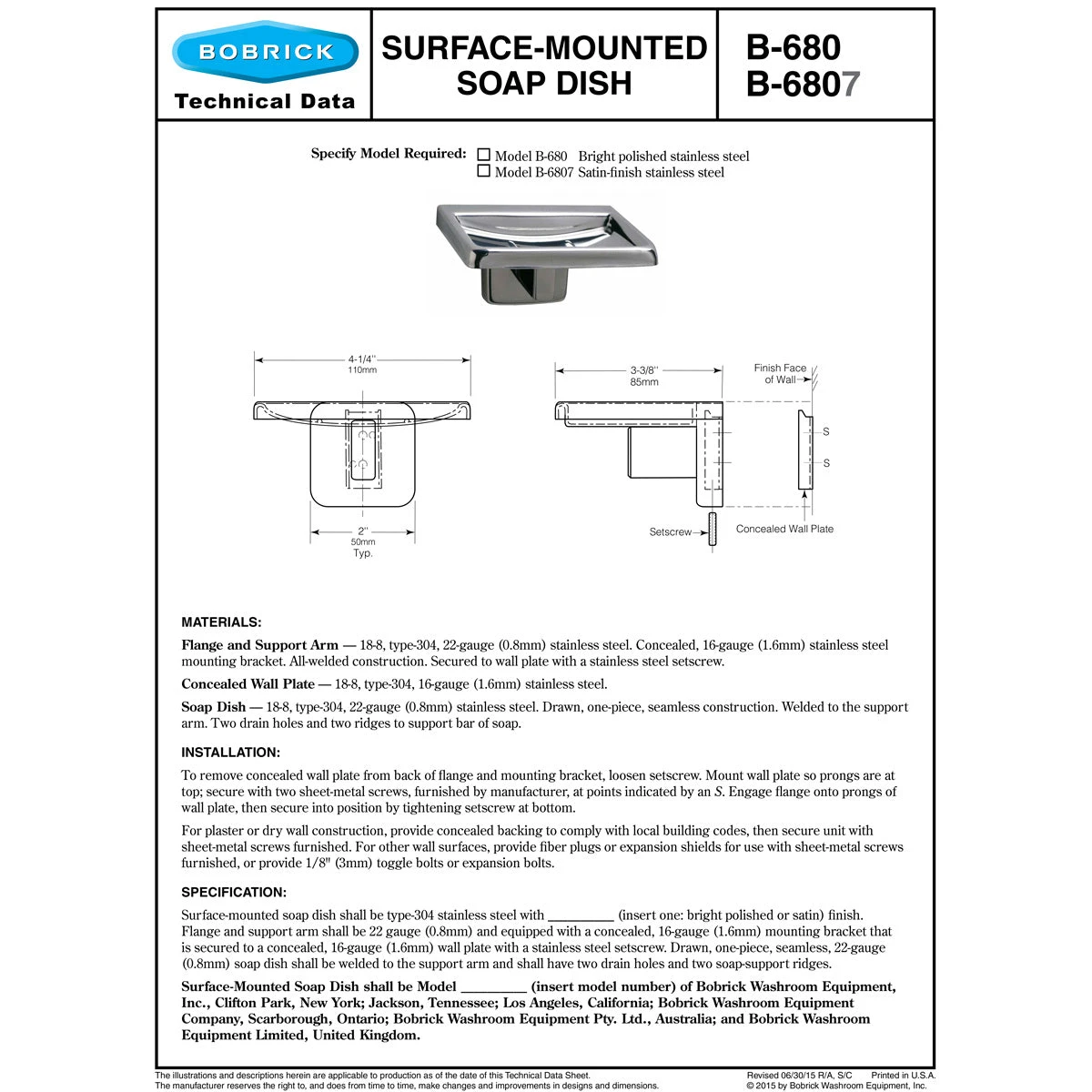 Stainless steel. Drawn, one-piece soap dish welded to support arm and flange. Two ridges hold soap; two drain holes. Unit 4 1/4″ W, 2″ H (110 x 50mm); projects 3 3/8″ (85mm) from wall. Available Soap Dish Finishes: B-680,Bright-polished. B-6807,Satin-Finish.