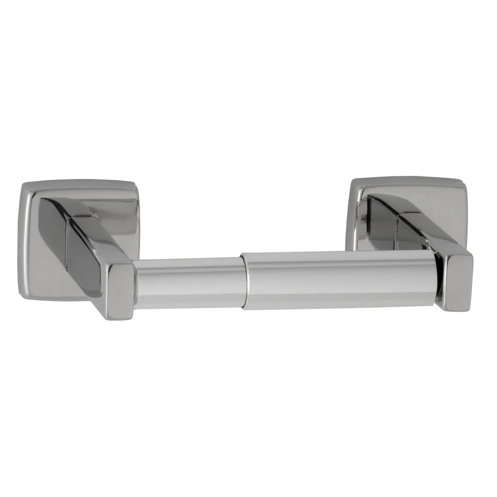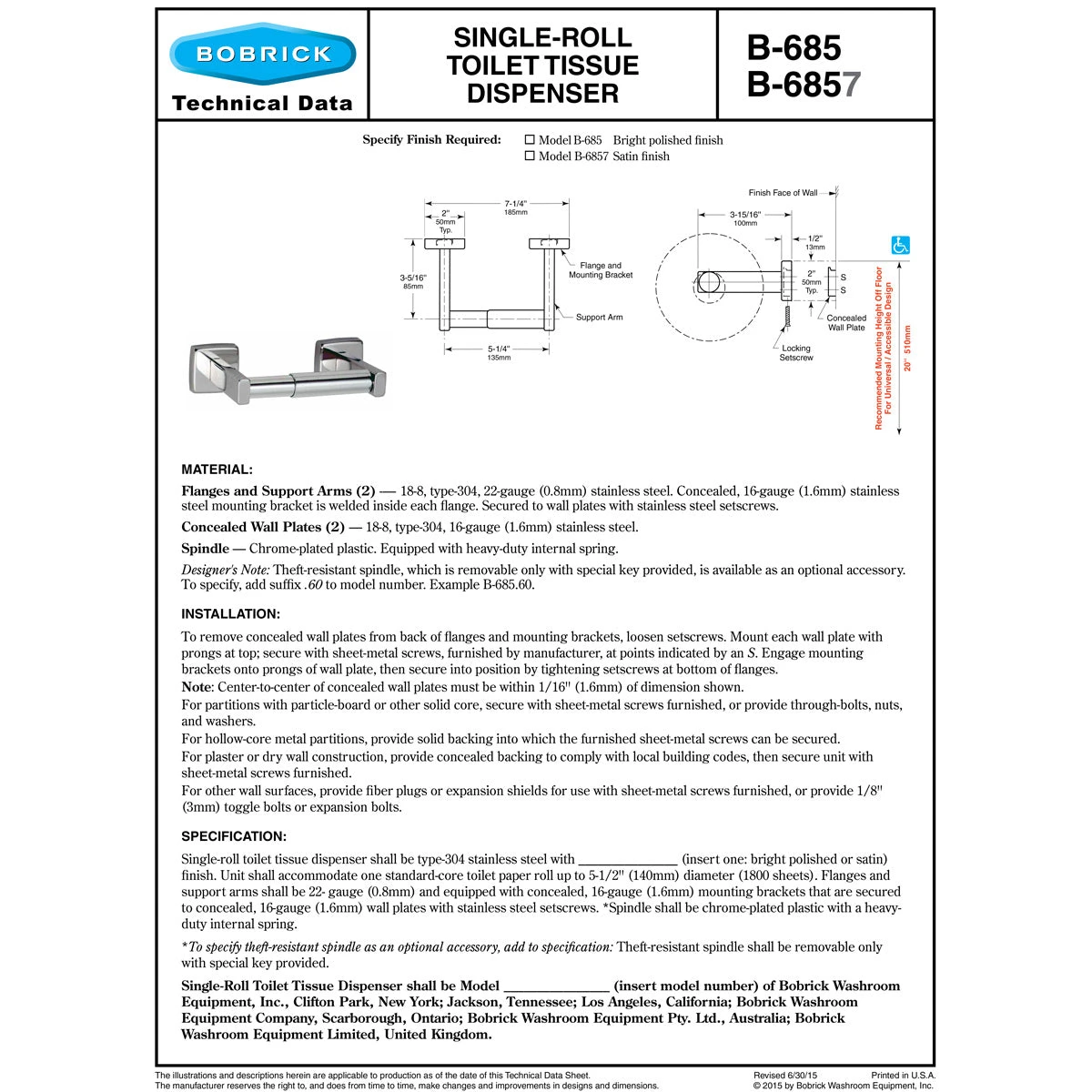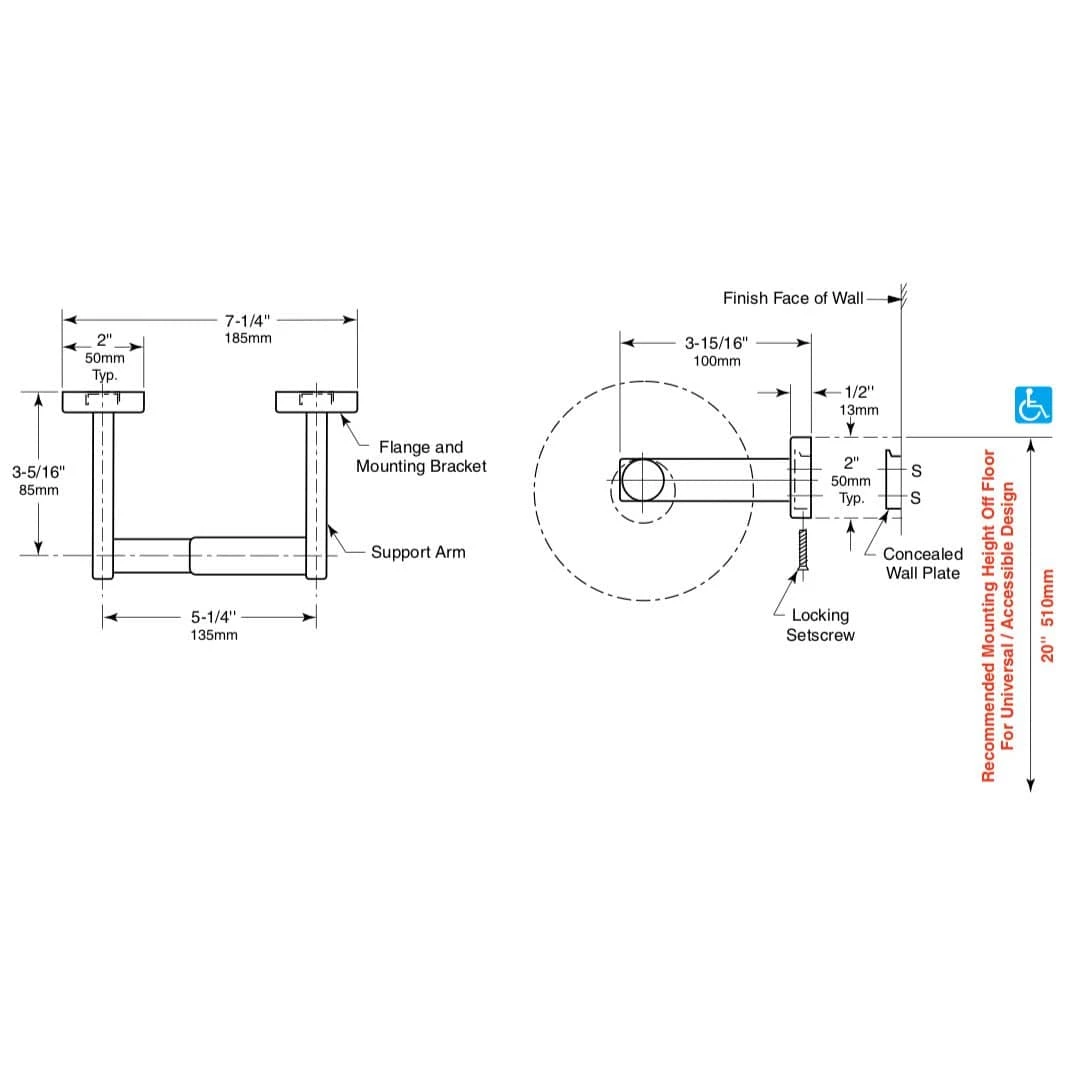 Bright-polished stainless steel. Support-arm flanges lock to concealed stainless steel wall plate. Chrome-plated plastic spindle holds rolls up to 5 1/2″ (140mm) diameter (1800 sheets). Unit 7 1/4″ W, 2″ H (185 x 50mm); projects 3 15/16″ (100mm) from wall.