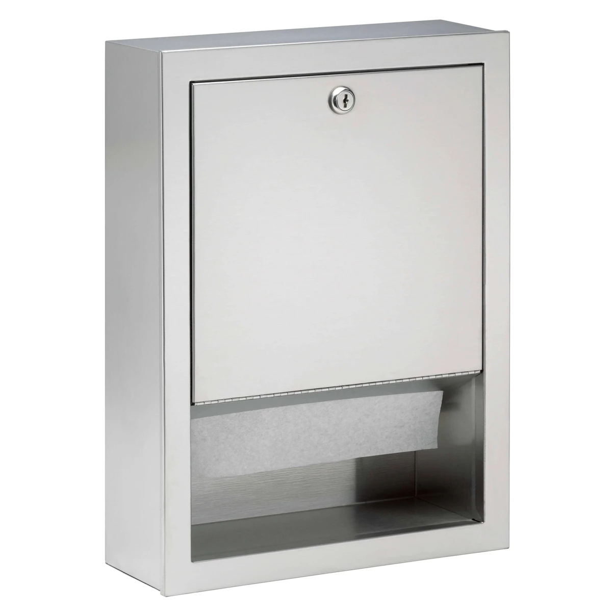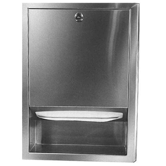Bradley Towel Dispenser. Heavy gauge stainless steel cabinet with exposed surfaces in architectural satin finish. Welded construction with seamless corners and burr-free edges. 22 gauge stainless steel door. Concealed, full-length stainless steel piano hinge. Door has one tumbler lock. Recess Mounted. Dispenses 475 Multi-Fold Paper Towels. Dispenses 350 C-Fold Paper Towels.