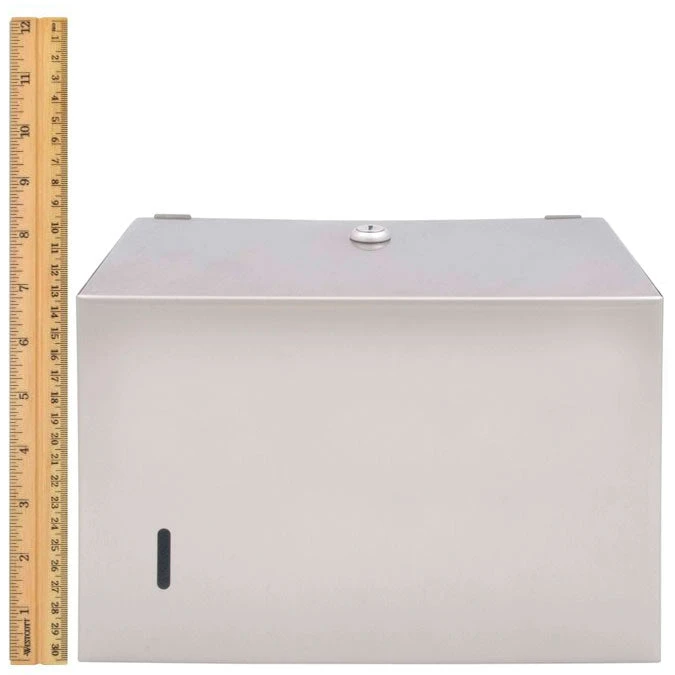 Bradley Towel Dispenser. Heavy gauge stainless steel cabinet with exposed surfaces in architectural satin finish. Welded construction with seamless corners and burr-free edges. 22 gauge stainless steel door. Door has one tumbler lock. Surface Mounted . Dispenses 400 single fold Paper Towels. Cabinet hinged at bottom of unit. Towel level indicator on face of unit.