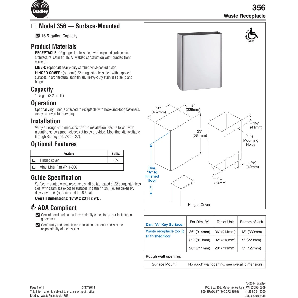 Bradley Waste Receptacle. 22 gauge stainless steel receptacle in architectural satin finish. All welded construction with rounded front corners. Surface-Mounted. 16.5 gallon capacity.
