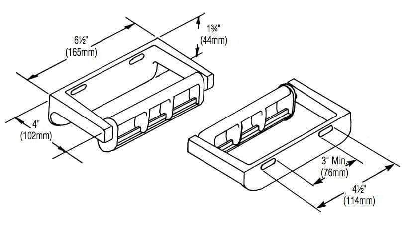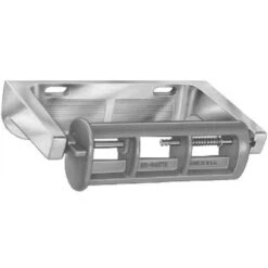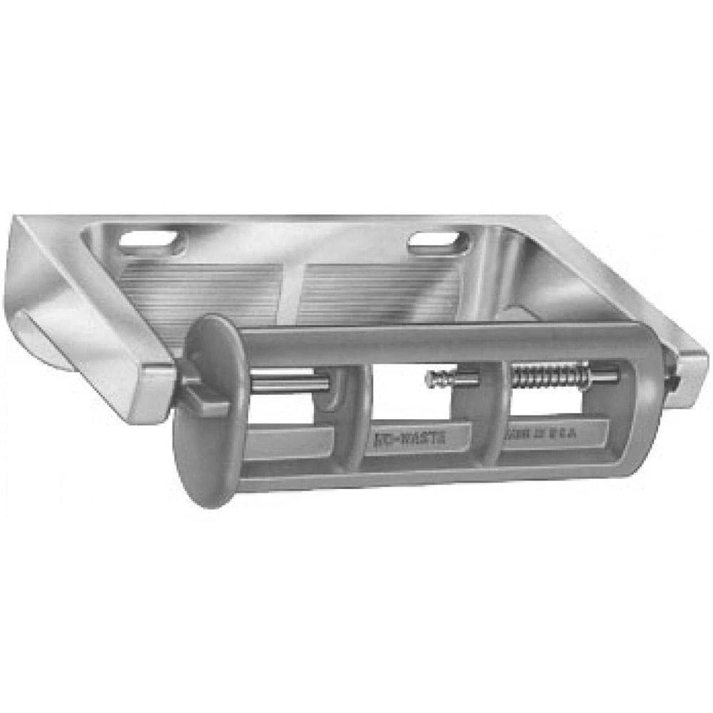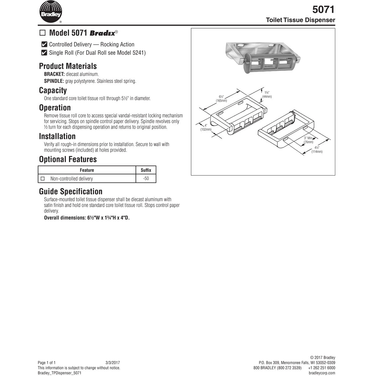 Bradley toilet tissue dispenser. Bracket made of diecast aluminum. Spindle made of gray polystyrene. Accommodates one toilet tissue roll up to 5.5 inches in diameter. Includes a vandal resistant locking mechanism. To refill paper, tear off tissue core and release spring. Surface mounted.