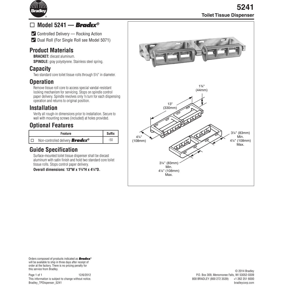 Bradley Toilet Tissue Dispenser. Diecast aluminum mounting bracket. Gray polystyrene spindle with stainless steel spring. Dispenses (2) rolls of up to 5in. core toilet tissue. Non-controlled delivery. Surface Mounted.