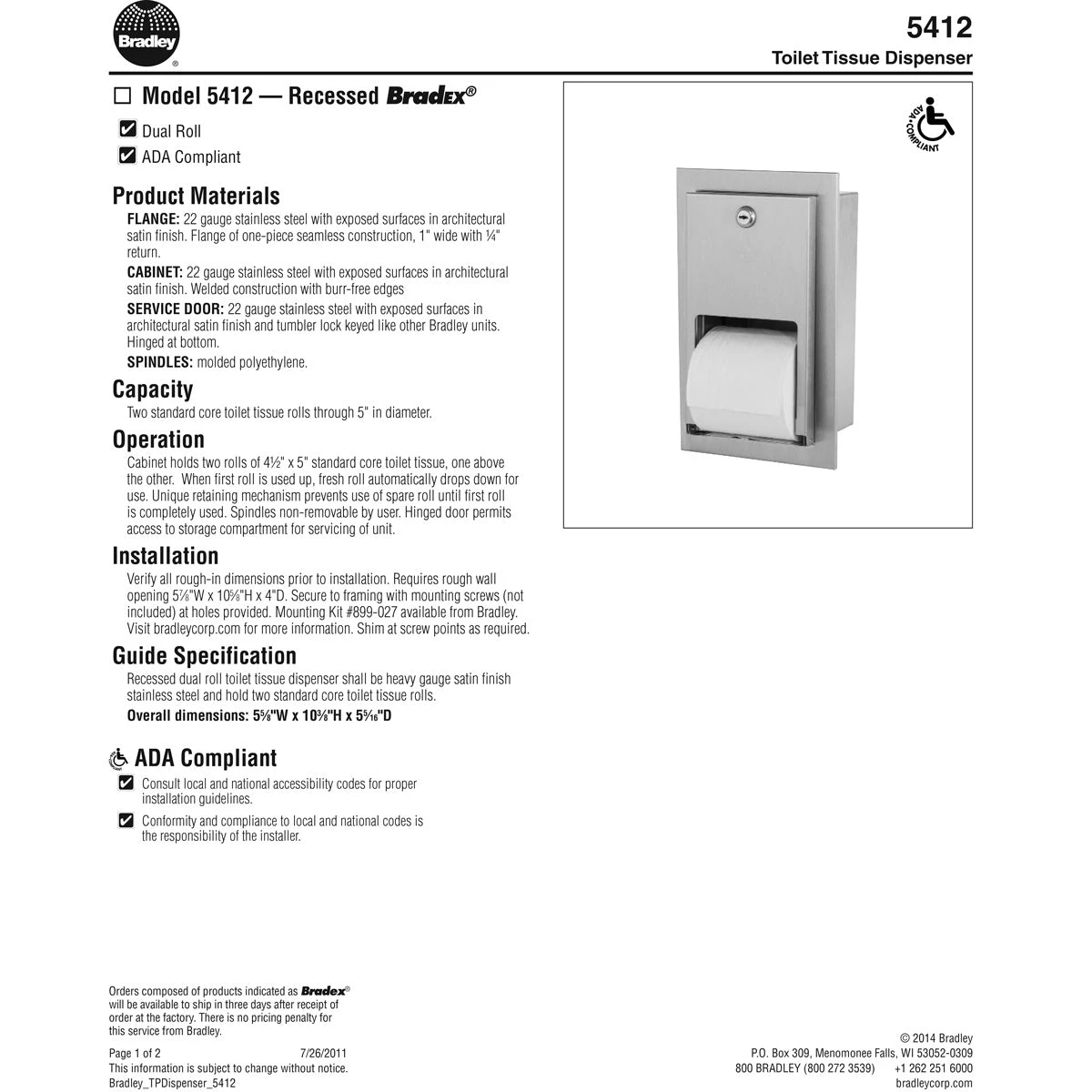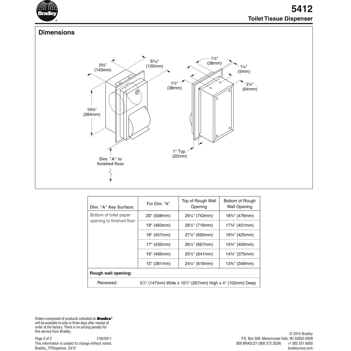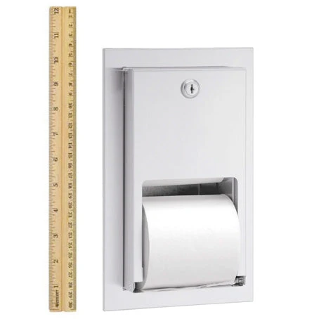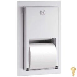 Bradley recessed toilet tissue dispenser. Cabinet and door are made of 22 gauge stainless steel with exposed surfaces in architectural satin finish. Dispenser holds two standard core roll up to 5 inches in diameter. When first roll is used up, second roll automatically drops down for use. Door includes a tumbler lock to keep prevent vandalism. ADA compliant.