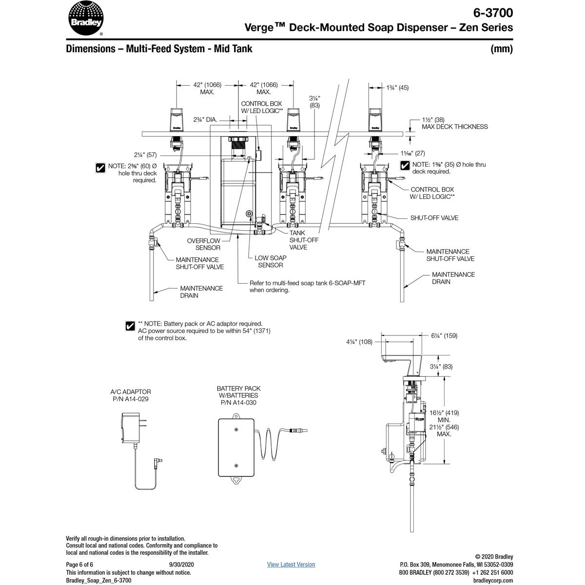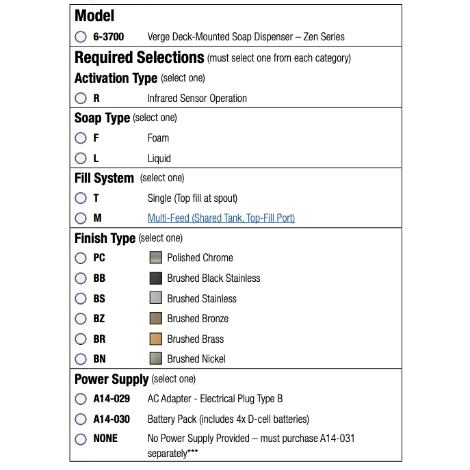 Verge Soap Dispenser Zen Series. Pairs with Verge Faucet model S53-3700 in Brushed Black. The dispenser is individual top-fill with a 70.5oz soap tank that is compatible with liquid soap with viscosity range of 100 cps – 5000 cps. Touch-free dual sensor activation optimized to eliminate false activations. Sleek design in chrome-plated cast brass construction with in-stock Brushed Black PVD finish. PVD finish is an intricate, environmentally friendly finishing process that molecularly bonds the finish to the spout, creating a very hard, durable surface that will not corrode or discolor. Power supply is selected separately and options are Battery pack (4xAA alkaline) or A/C Adapter. Indicator light at the base of the spout to indicate power, activation & low soap. Vandal-resistant construction including anti-rotational gasket/washer. Complies with ADA guidelines. Certified UL & CE Electrical Components. Certified ADA / ICC ANSI 117.1, Citation 309.4.
