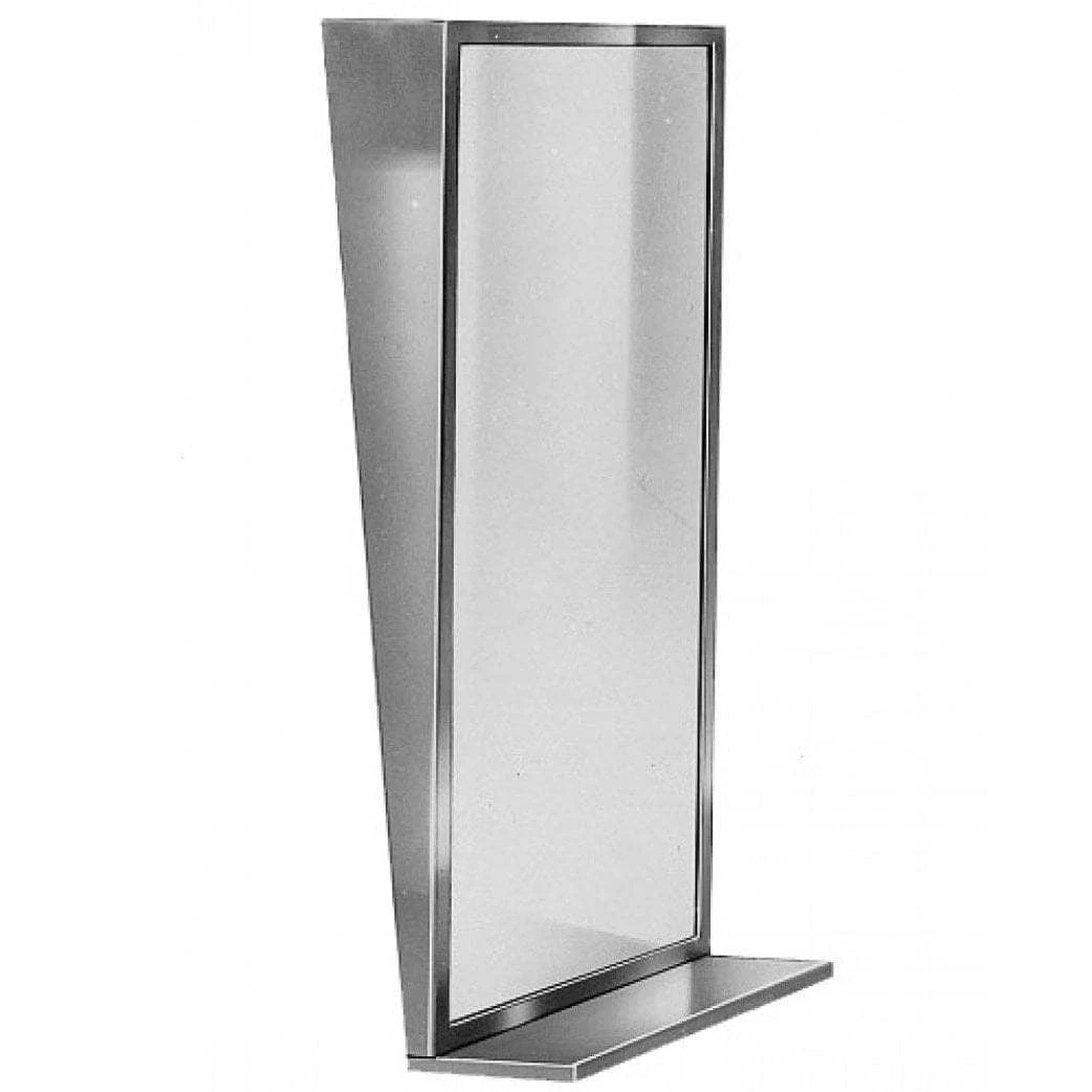 Top quality Bradley mirror designed for commercial restroom applications. One piece roll formed stainless steel frame with corners welded, ground and polished smooth to a satin finish. First quality 1/4 inch float glass, triple-silver-plated with electro-copper-plated layer and thermosetting infrared cured paint packing with Poly-Glaze protective finish. Fixed tilt 6 degree angle with added shelf. Includes wall hanger. 18 gauge cold rolled steel, all welded construction. Installer to provide mounting hardware. Mirror is 18 inches wide by 36 inches high. Mirror glass manufactured in accordance with ASTM C 1036. ADA compliant.