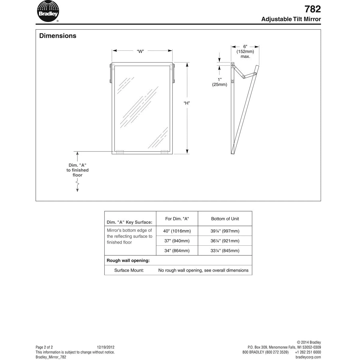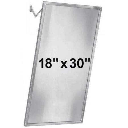 Top quality Bradley mirror designed for commercial restroom applications. One piece roll formed stainless steel frame with corners welded, ground and polished smooth to a satin finish. First quality 1/4 inch float glass, triple-silver-plated with electro-copper-plated layer and thermosetting infrared cured paint packing with Poly-Glaze protective finish. Adjustable tilt – mirror can be tilted 6 inches outward. Includes wall hanger – 18 gauge cold rolled steel, all welded construction. Installer to provide mounting hardware. Mirror is 18 inches wide by 30 inches high. Mirror glass manufactured in accordance with ASTM C 1036. ADA compliant.