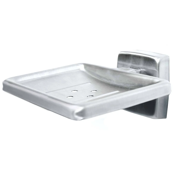 Surface mounted soap dish. Made of satin finish stainless steel. Unit has drainage holes to prevent standing water in dish.