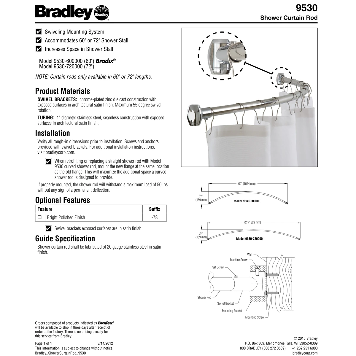 Bradley curved shower rod. Heavy duty shower curtain rod 20 gauge stainless steel tubing, seamless construction. 72 inch length. 1 inch diameter stainless steel tubing, seamless construction with exposed surfaces in architectural satin finish. Exposed flange. Satin finish. Swivel brackets made from chrome plated die cast construction with exposed surfaces in architectural satin finish. Maximum 55 degree swivel rotation. Sourced from US Manufacturers.
