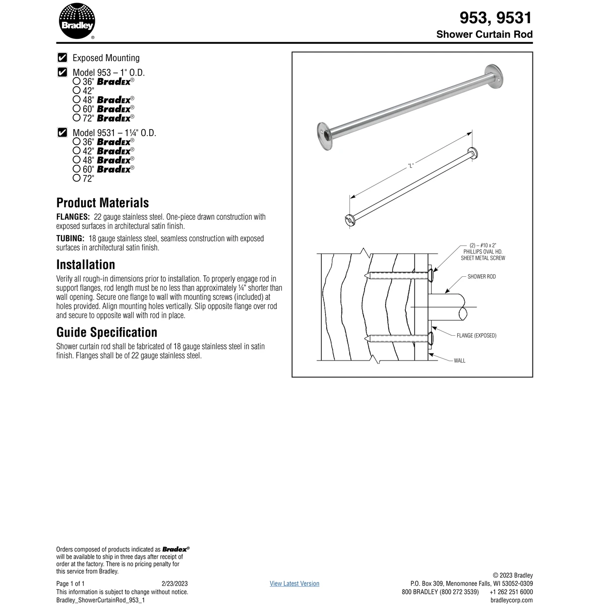 Bradley Shower Rod. Heavy duty Shower Curtain Rod 18 gauge stainless steel tubing, seamless construction. 36in. length. 1.25in. diameter stainless steel tubing, seamless construction with exposed surfaces in architectural satin finish. Exposed Flange. 22 gauge stainless steel flanges. One-piece drawn construction with exposed surfaces in architectural satin finish. Satin Finish.