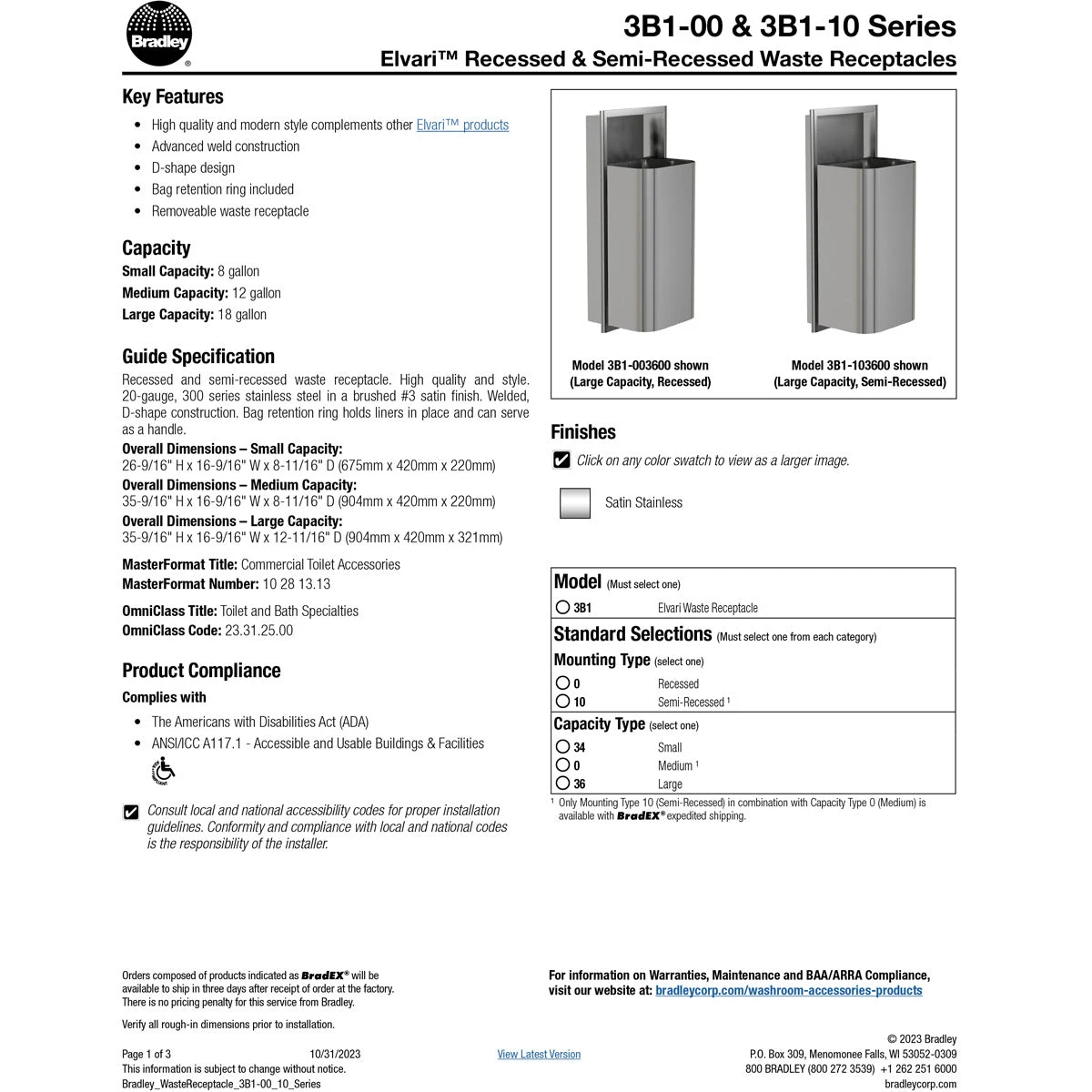 Bradley Elvari Series Waste Receptacles – Recessed, Large Capacity, 12 GAL – 3B1-003600
