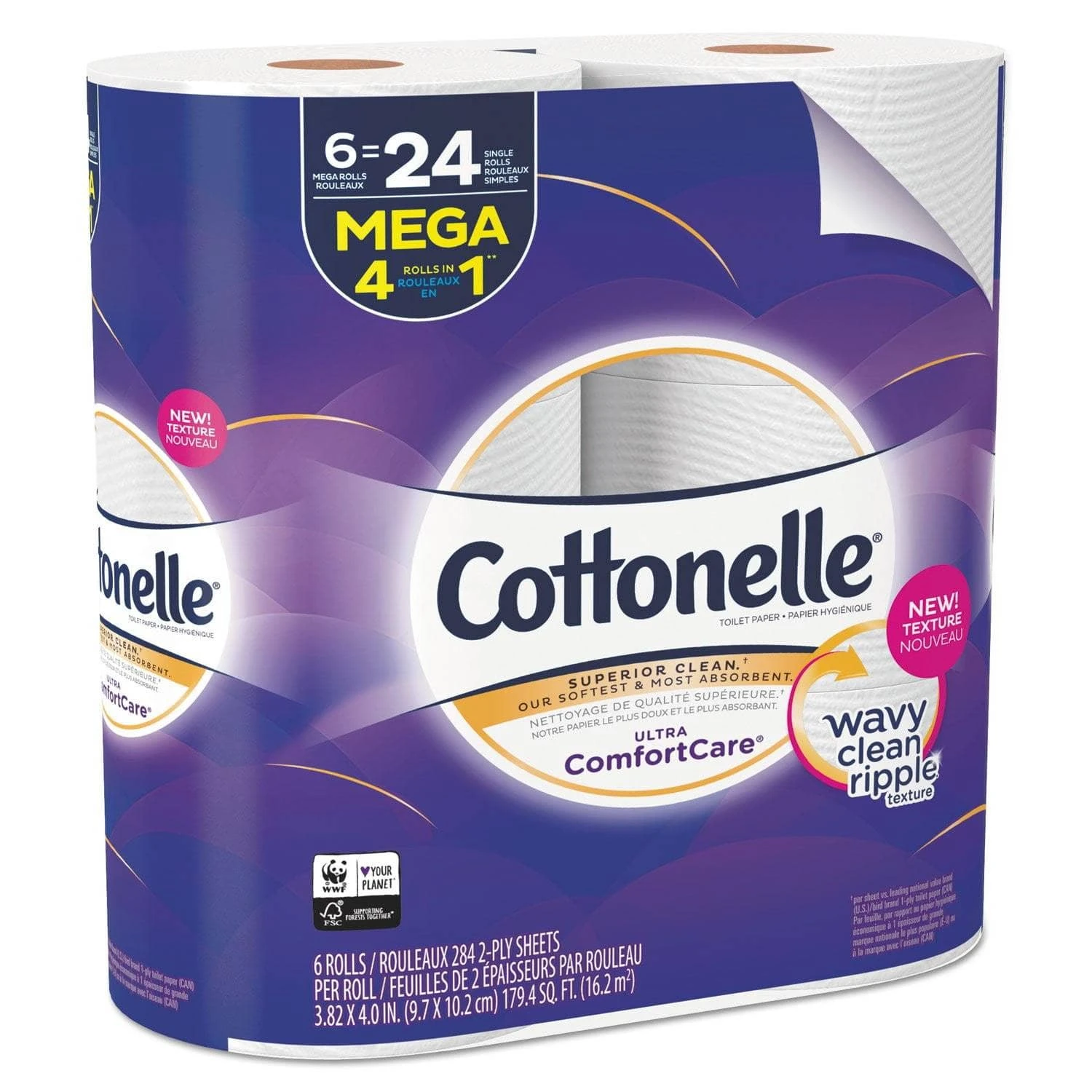 Cottonelle ComfortCare two ply toilet tissue is made from fibers that are septic-safe, sewer-safe, and paraben-free. Uniquely designed with a Wavy CleanRipple Texture that removes more and is three times thicker and stronger. Cottonelle ComfortCare Bathroom Tissue is premium bathroom tissue that is exceptionally soft, designed with strength, for an effective clean. 6 Rolls per Pack/36 Rolls per Carton. Tissue Type: Toilet; Number of Plies: 2; Number of Sheets: 284 per roll; Length: 4″.