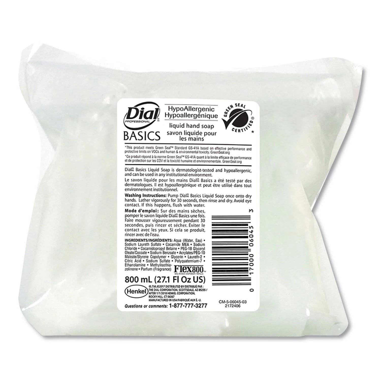 Basics Liquid Hand Soap Mild soap that is gentle on skin. Its rich, creamy lather rinses clean and leaves hands feeling soft and smooth. Dermatologist-tested and hypoallergenic formula nourishes and helps soothe dry skin, making it perfect for any commercial setting. For Use with Dial Professional 800 mL Manual Liquid Dispenser. Soap Type: Liquid; Application: Hand; Capacity (Volume): 800 mL; Scent: Fresh Floral.