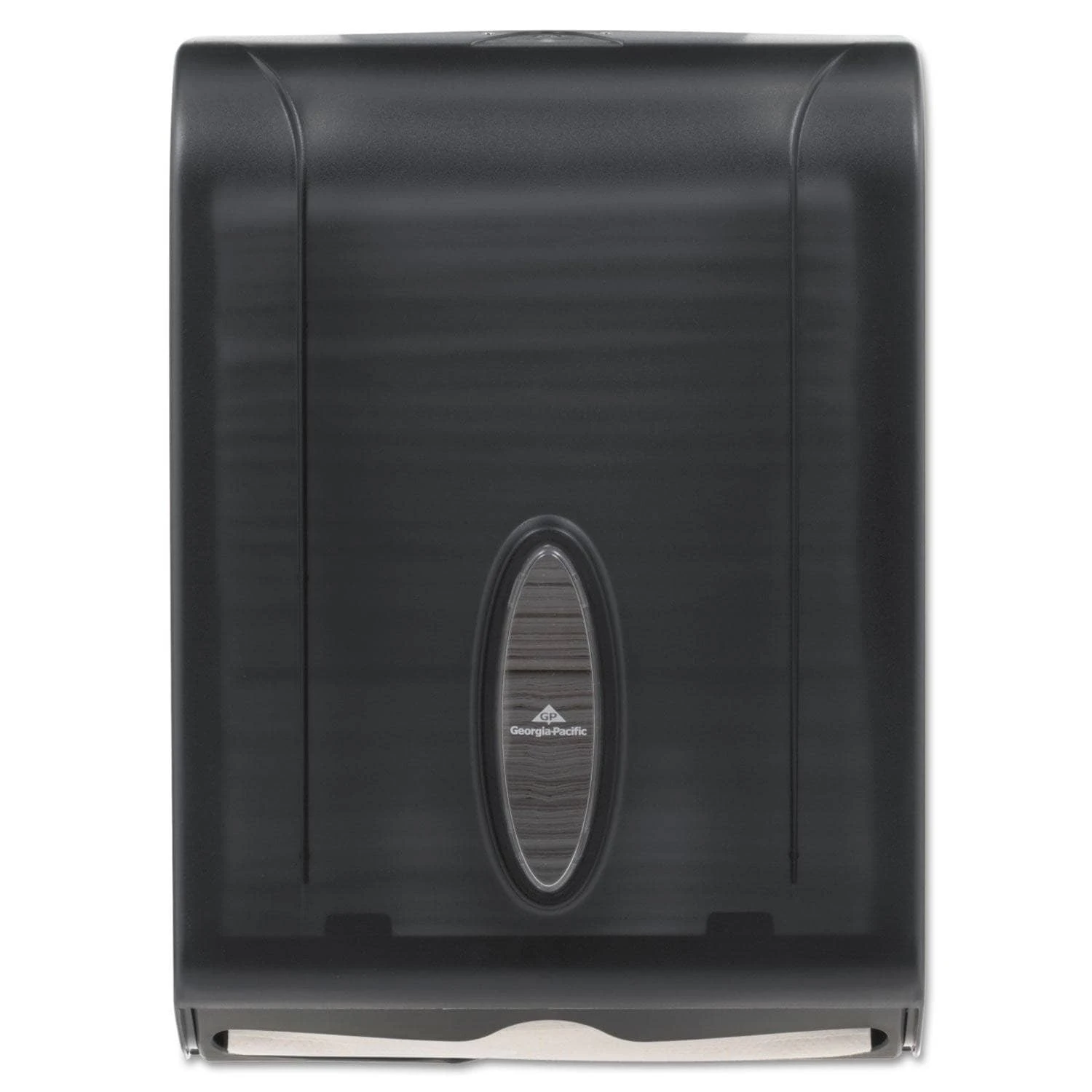 Flip-down plate instantly converts to dispense C-Fold, Multifold or BigFold towels. Door ramp design prevents overstuffing. Covered key lock protects against waste and pilferage. Large capacity: 400 C-Fold, 600 Multifold towels or one package of BigFold towels. Mounts with screws (not incl.). See-through plastic cover. Towels Dispensers Type: Folded Towel Dispenser; Color(s): Translucent Smoke; Depth: 5 1/4″; Height: 15 2/5″.