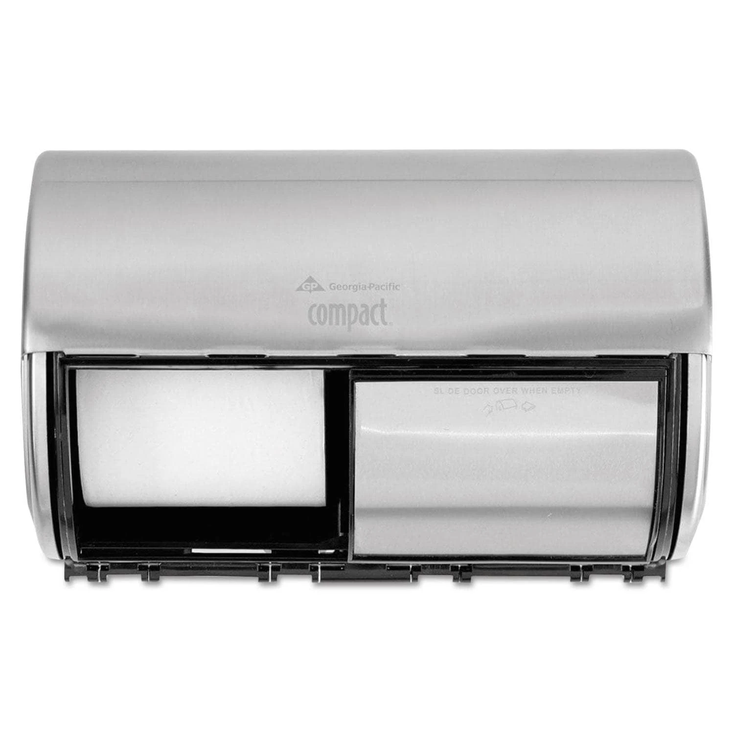 High-capacity coreless tissue system dispenses up to 3,000 two-ply sheets of tissue, which is up to six times the capacity of single standard two-ply rolls while maintaining a professional look. Transfer paddle prevents access to new roll before current roll is completely used. See-through, high-impact plastic cover permits monitoring of paper supply. Holds up to two 5 3/4” diameter Compact Coreless rolls (GEP-19375, sold separately). Locking dispenser prevents pilferage. For Roll Size: 5.75″; Roll Type: Coreless; Capacity (text): Holds Two Coreless Rolls; Color(s): Stainless Steel.