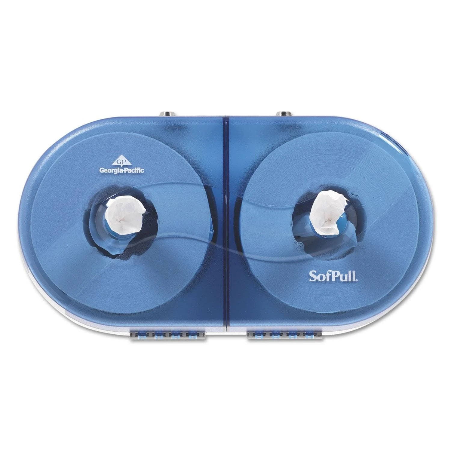 Put a smart new spin on bath tissue: one-sheet-at-a-time dispensing. Twin high-capacity tissue solution helps reduce costs, while helping to improve hygiene. Translucent cover shows when a roll is ready to be changed. Sturdy dispenser is made of polycarbonate for additional strength. Cover also hinges at the bottom for easy mounting and loading. Twin dispenser provides added capacity, for fewer run-outs. For Roll Size: SofPull High Capacity Centerpull Tissue; Roll Type: Center-Pull; Capacity (text): Holds One 8.4″ Roll; Color(s): Splash Blue.