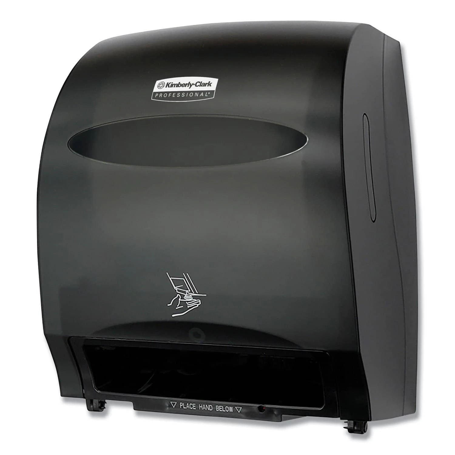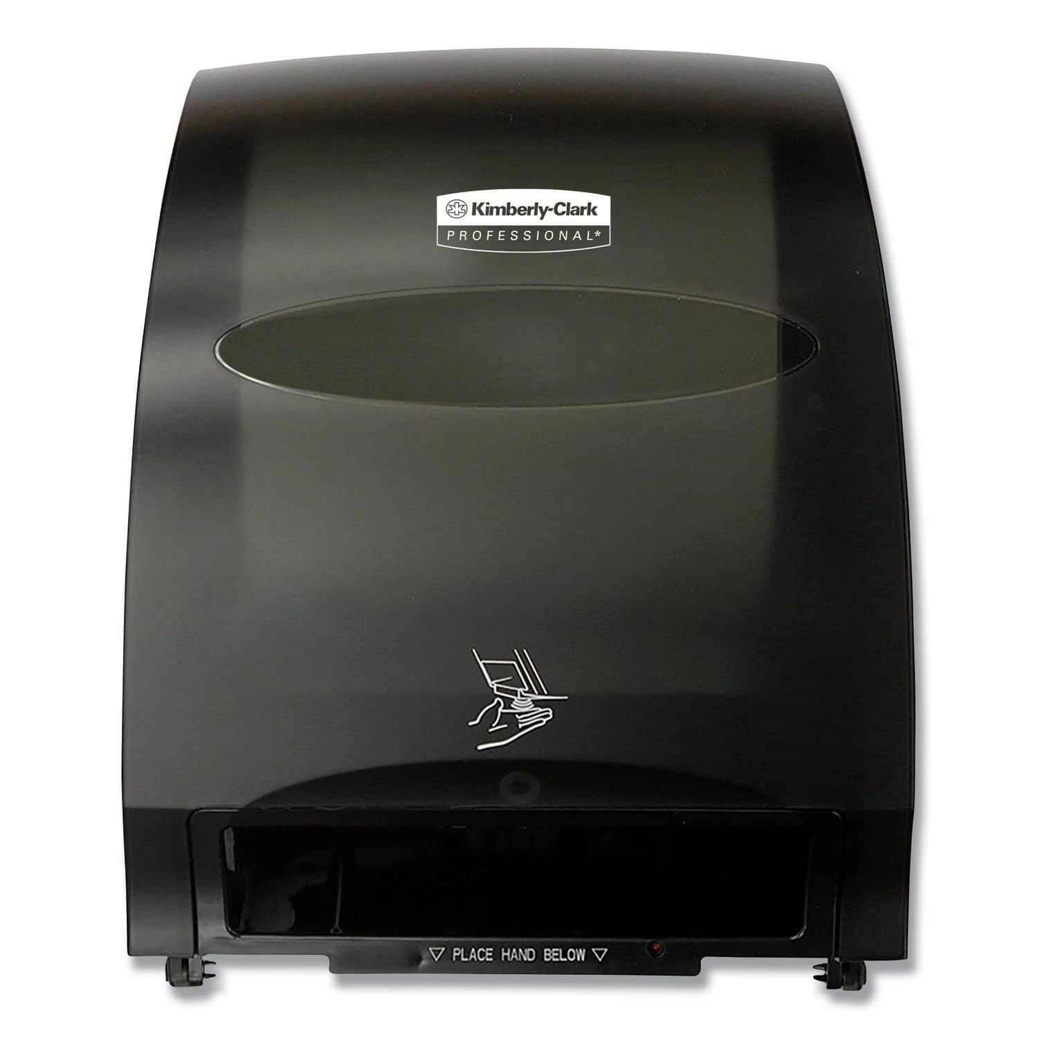 Reduce the hassle of restroom maintenance with the high-capacity Kimberly-Clark Professional Automatic Towel Dispenser. This touchless, wall mount roll towel dispenser needs infrequent refilling and provides consistent, reliable performance. Your washroom guests will enjoy the benefits of hygienic, touch free dispensing – they’ll only touch the towel they’re using. This high capacity towel dispenser is made of high impact smoke colored plastic. The unit dispenses a nominal 11″ of towel when activated by placing hand under the unit. A second sheet will dispense at 10% reduced length when activated within a few seconds. Features include a quiet dispensing system, quick load capability and choice of key-activated spring lock or push button operation. Towels Dispensers Type: Hardwound Roll Towel Dispenser; Material(s): Plastic; Capacity (text): 950 ft Roll; Color(s): Black.