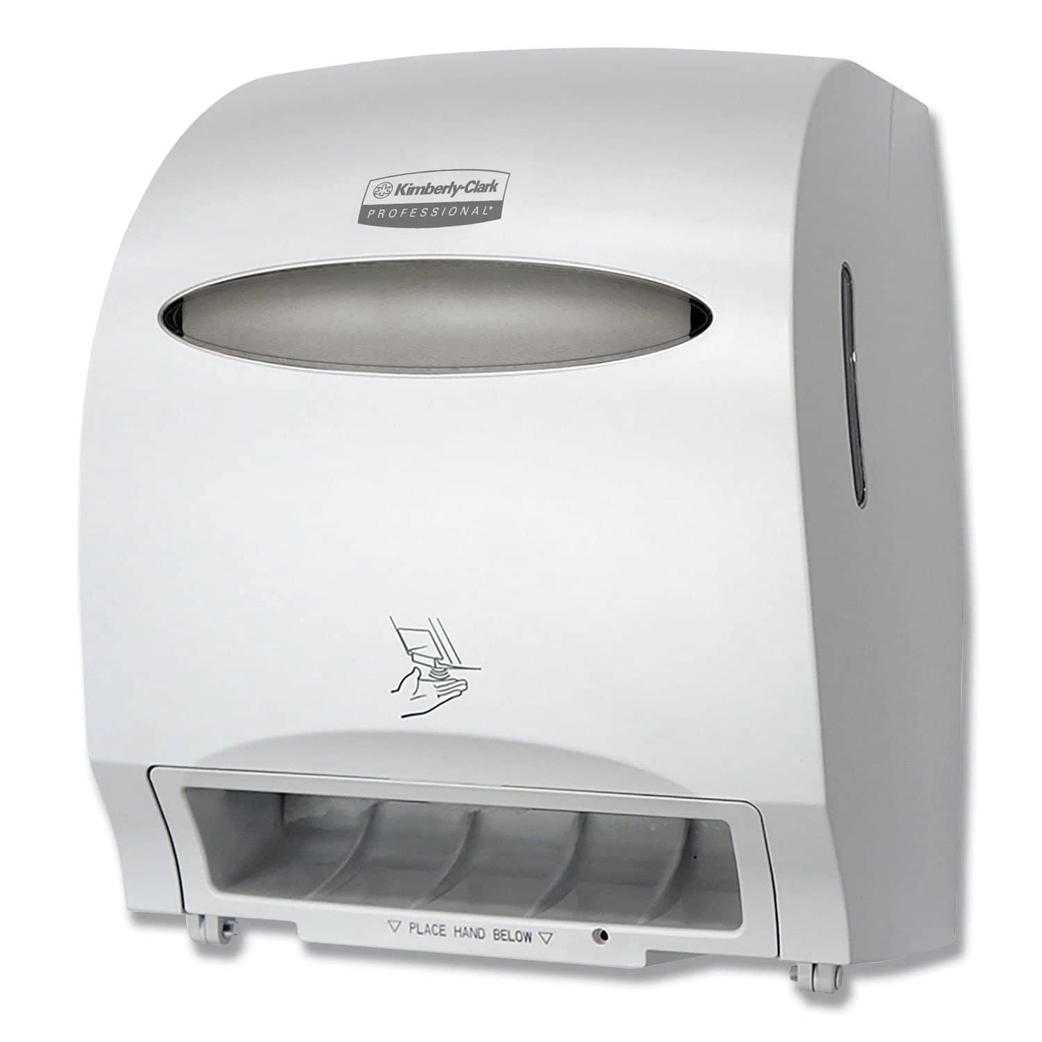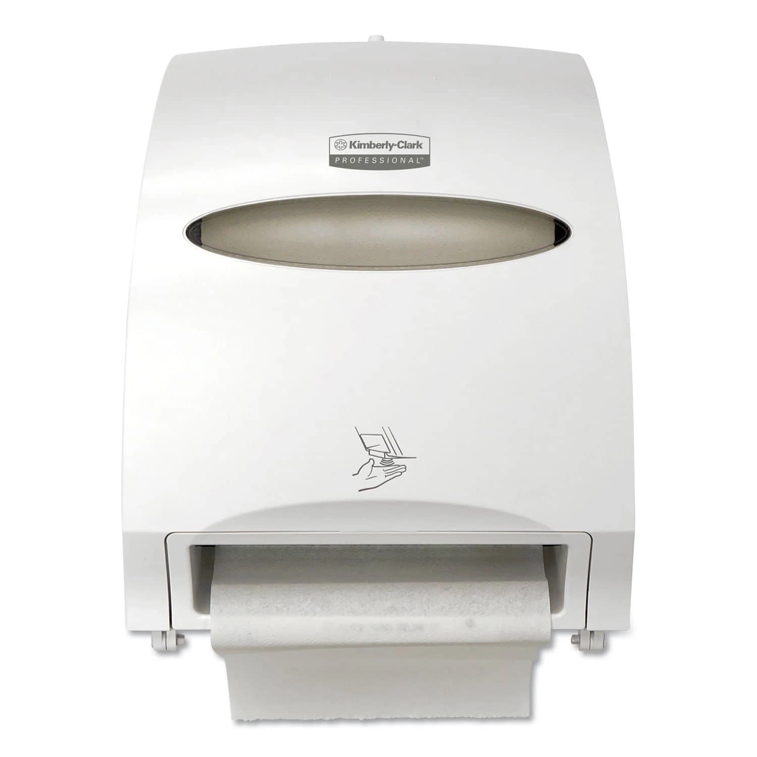 Reduce the hassle of restroom maintenance with the high-capacity Kimberly-Clark Professional Automatic Towel Dispenser. This touchless, wall mount roll towel dispenser needs infrequent refilling and provides consistent, reliable performance. Your washroom guests will enjoy the benefits of hygienic, touch free dispensing – they’ll only touch the towel they’re using. This high capacity towel dispenser is made of high impact smoke colored plastic. The unit dispenses a nominal 11″ of towel when activated by placing hand under the unit. A second sheet will dispense at 10% reduced length when activated within a few seconds. Features include a quiet dispensing system, quick load capability and choice of key-activated spring lock or push button operation. Towels Dispensers Type: Hardwound Roll Towel Dispenser; Material(s): Plastic; Capacity (text): 950 ft Roll; Color(s): White.