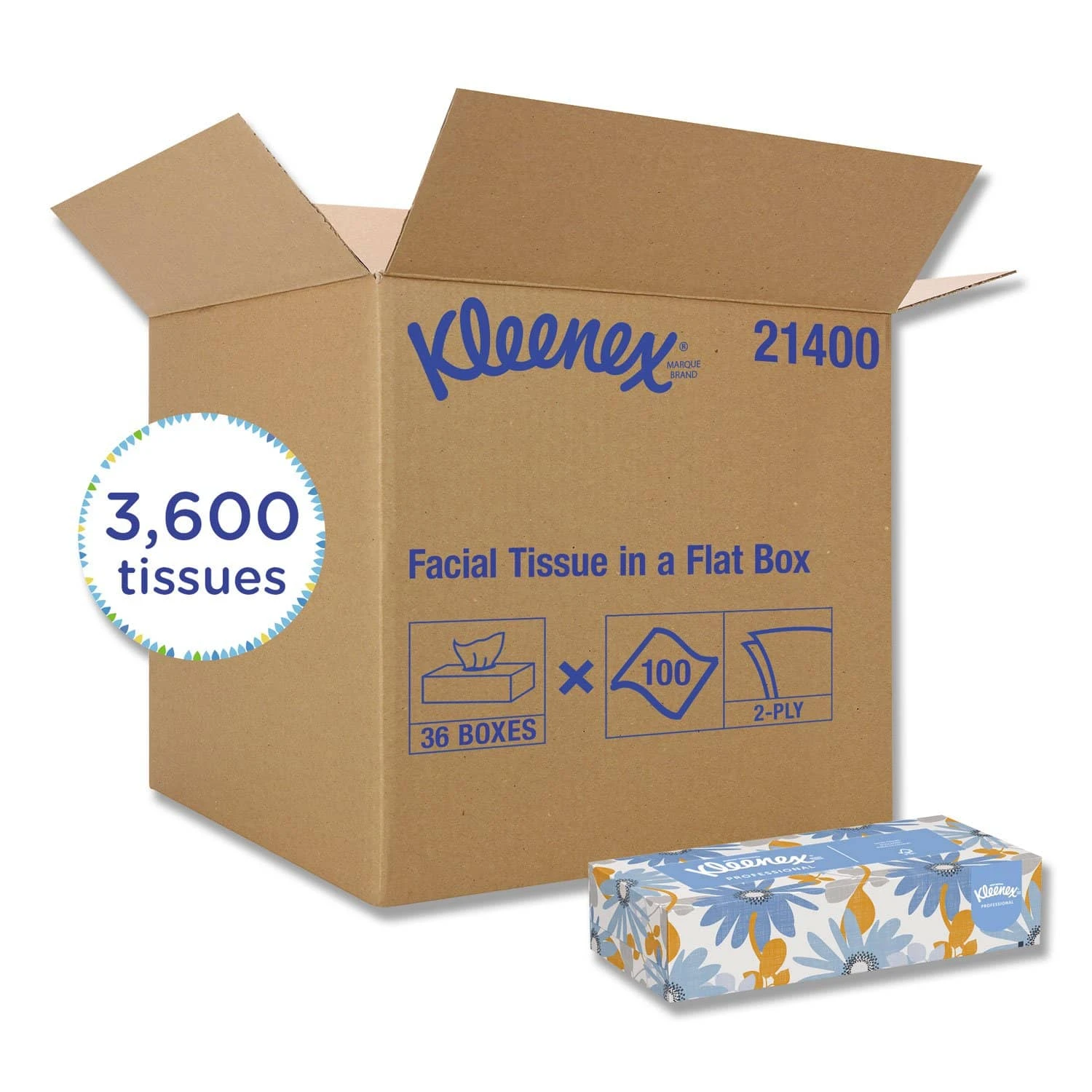 Kleenex Facial Tissue (flat box) delivers premium quality and is preferred for its superior softness, absorbency and strength. Tissue Type: Facial; Number of Plies: 2; Number of Sheets: 100 per box; Length: 8.2″.