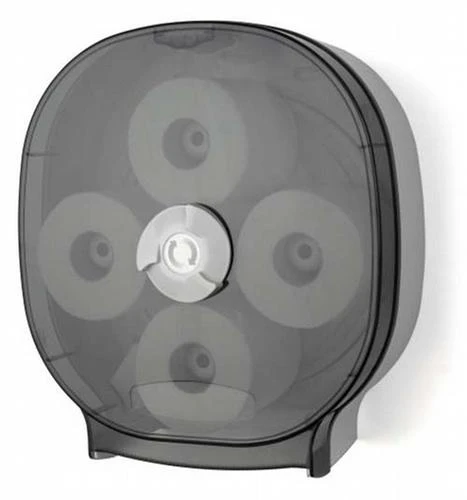 The 4-Roll Carousel standard tissue dispenser with a Translucent Dark cover and beige back, features a roll advance mechanism that ensures that a roll must be completely used before switching to a new one. The easy loading dispenser is fully enclosed for maximum hygiene and the locked hinged cover eliminates theft and waste. The translucent cover allows view of paper supply. Holds any standard household tissue roll with 1 1/2″ core.