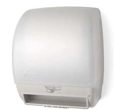 The Electra Automatic Touchfree Roll Towel Dispenser with the Translucent White cover and beige back is created for maximum flexibility and cost reduction. This universal dispenser is automatic, hygienic, and enables hands-free operation. Dispenser holds any universal 8″ x 8″ roll towel and 2 3/4″ stub roll with a 1 1/2″ to 2″ core. Paper is fully protected until user is ready preventing cross-contamination–no paper hangs out. There is an easy to load auto-transfer system that prevents stub roll waste. It operates on 4 D-sized alkaline batteries with the longest battery life in the industry-up to 72,000 cycles. There is a low battery indicator light and the translucent cover allows for a view of the paper supply. Unit features adjustable settings for optimal paper usage control. The Select Paper Savings mode allows adjustment of second sheet length making it shorter by 25%, 0%, 12% than the initial dispense when the second dispense is within 3 seconds of the initial dispense. The Set Time Delay mode can be set for 3 seconds, 2 seconds, or 1 second. The Sheet Length mode can be set for 15″, 12″, 9″ of paper.