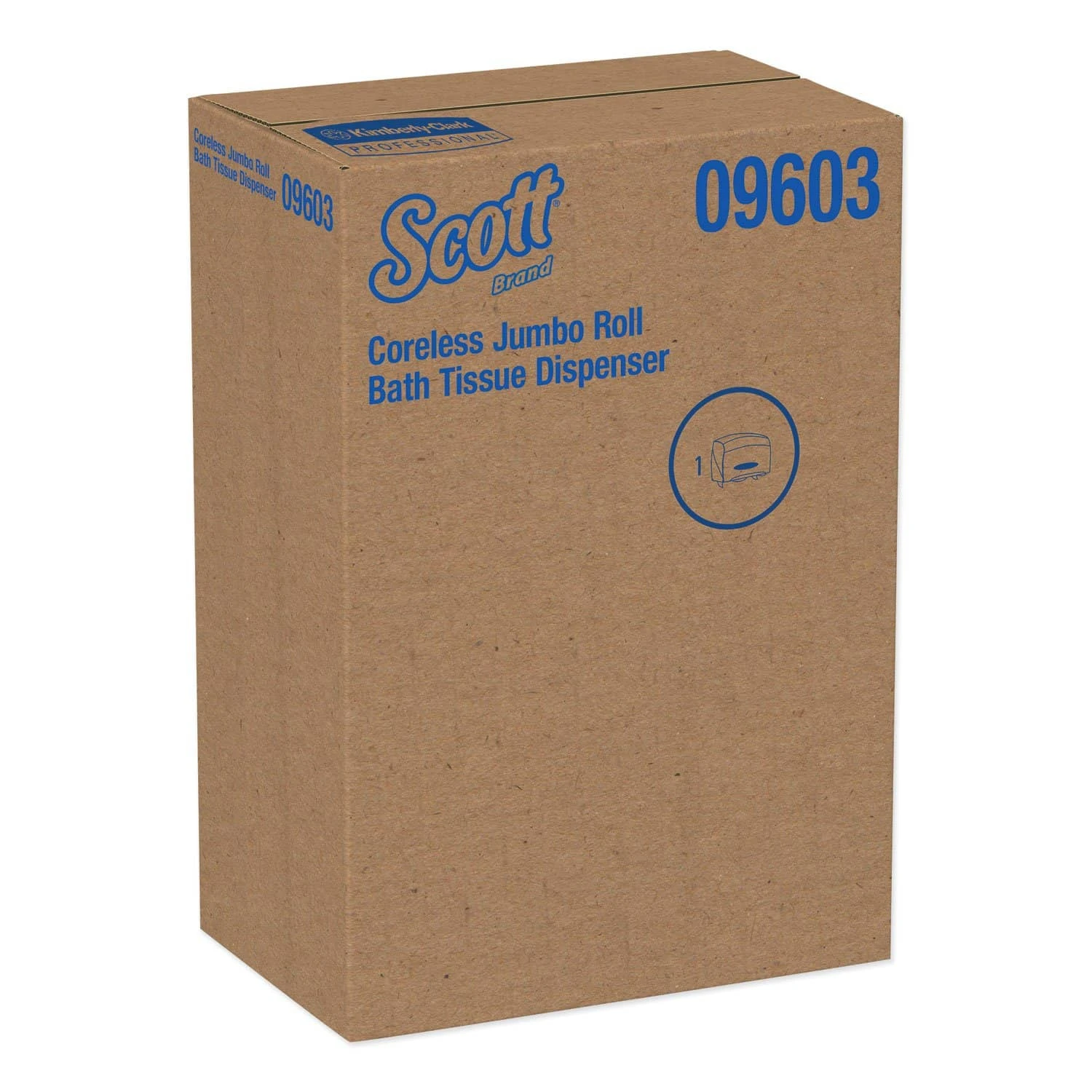 High-capacity bath tissue system perfect for your busy workplace. Keyless, one-handed reloading for easy maintenance; no moving parts. Durable plastic. Holds SCOTT Coreless JRT Jr. rolls (sold separately). For Roll Size: 3 3/4w x 9dia; Roll Type: Coreless JRT; Capacity (text): Holds One Coreless JRT Roll; Color(s): White.
