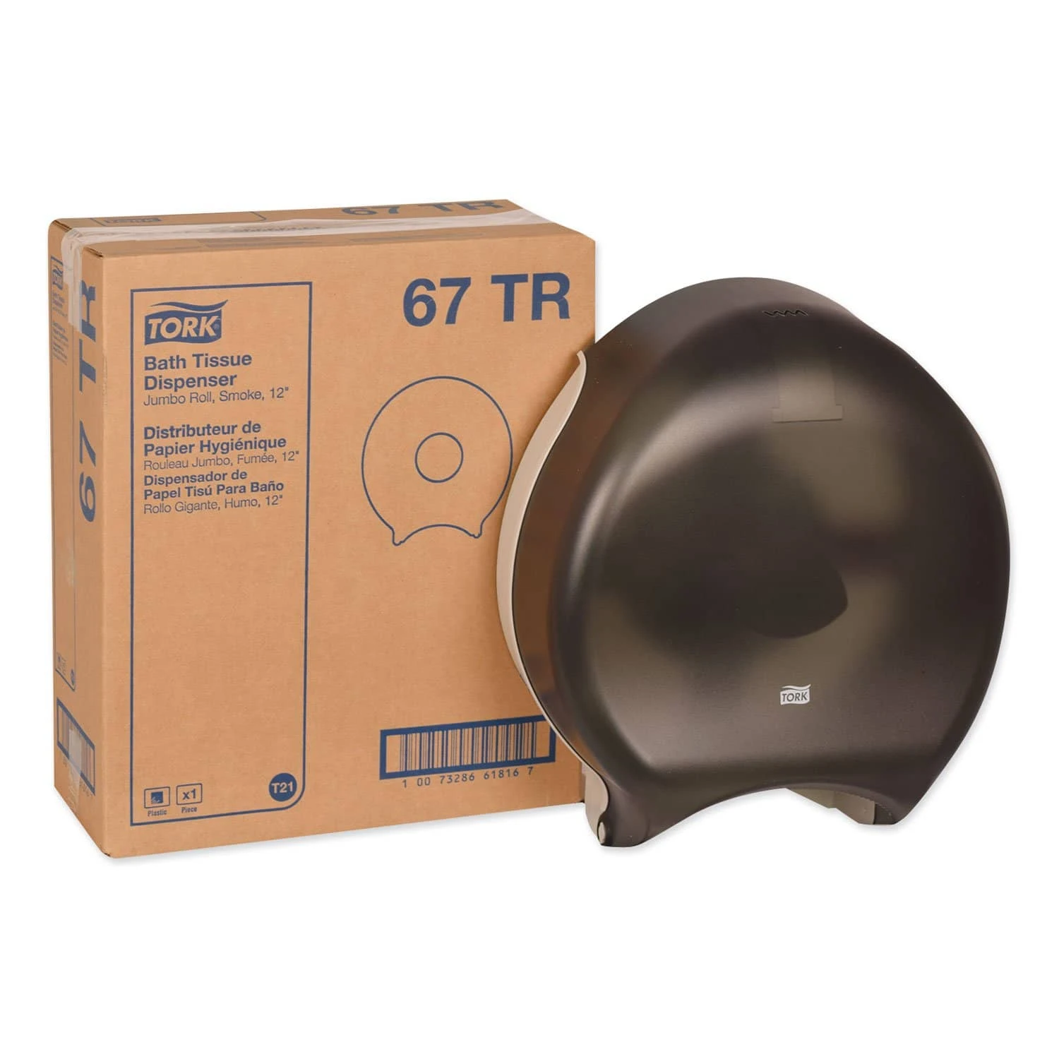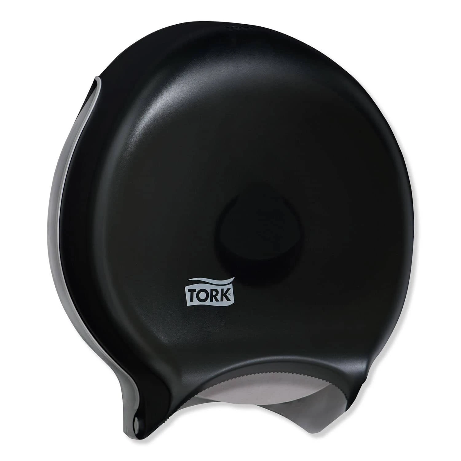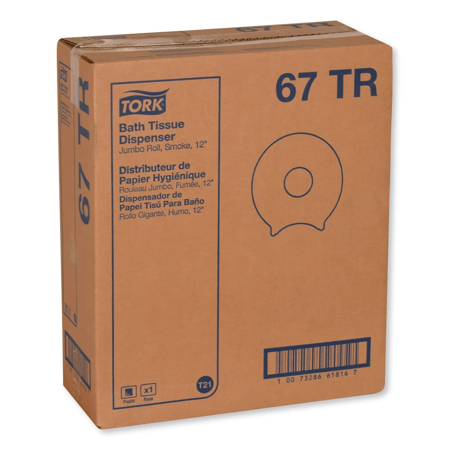 The Tork Jumbo Bath Tissue Dispenser is a high capacity dispenser solution that helps to reduce maintenance costs and service interruptions, suitable for any washroom or restroom environment. This clean, modern appearance complements all decors. The translucent front cover allows for “at a glance” inspection to know when refills are needed. Smooth cover is easy to clean and maintain. Built-in pilferage control with this locked dispenser, key included. High impact plastic and design help prevent damage. For Roll Size: 11.8″ Diameter; Roll Type: Jumbo Roll Bath Tissue; Capacity (text): Holds One 12″ Jumbo Roll; Color(s): Smoke.